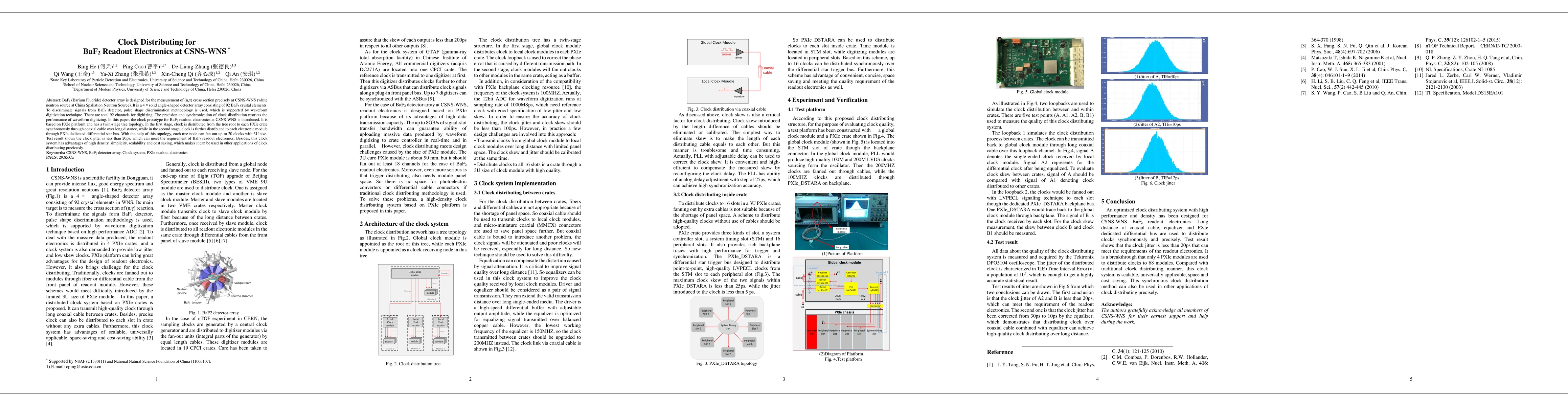 This paper introduces a clock distribution prototype for BaF2 detector readout electronics at CSNS-WNS, employing a twin-stage tree topology on a PXIe platform to ensure precise synchronization and low jitter (less than 20ps). The system supports scalability and cost-efficiency, enhancing the performance of waveform digitization for (n,γ) cross section measurement.