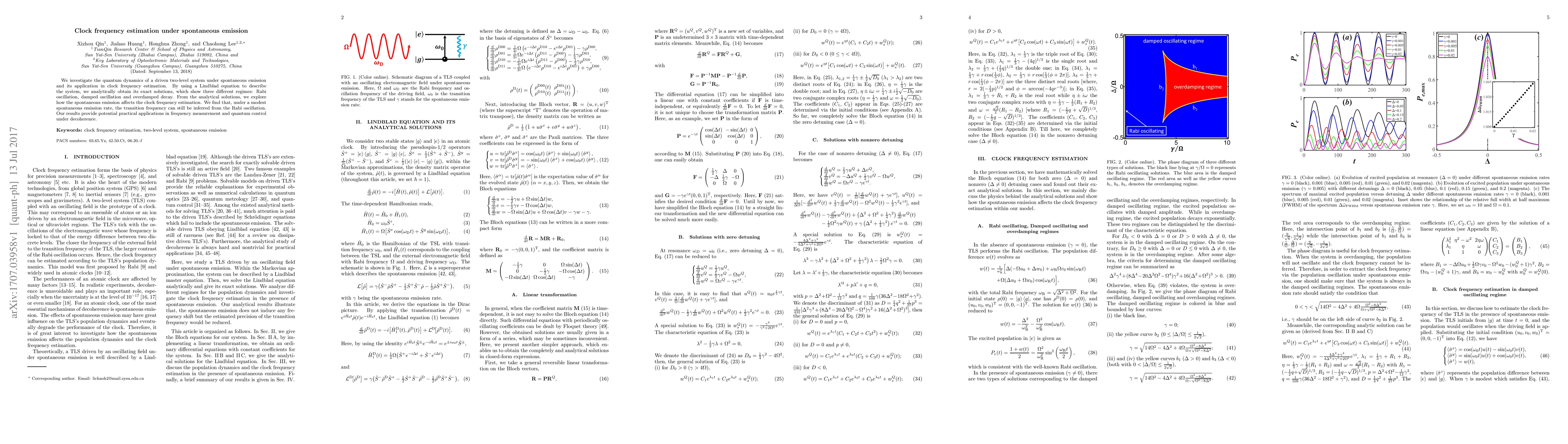 We investigate the quantum dynamics of a driven two-level system under spontaneous emission and its application in clock frequency estimation. By using a Lindblad equation to describe the system, we analytically obtain its exact solutions, which show three different regimes: Rabi oscillation, damped oscillation and overdamped decay. From the analytical solutions, we explore how the spontaneous emission affects the clock frequency estimation. We find that, under a modest spontaneous emission rate, the transition frequency can still be inferred from the Rabi oscillation. Our results provide potential practical applications in frequency measurement and quantum control under decoherence.