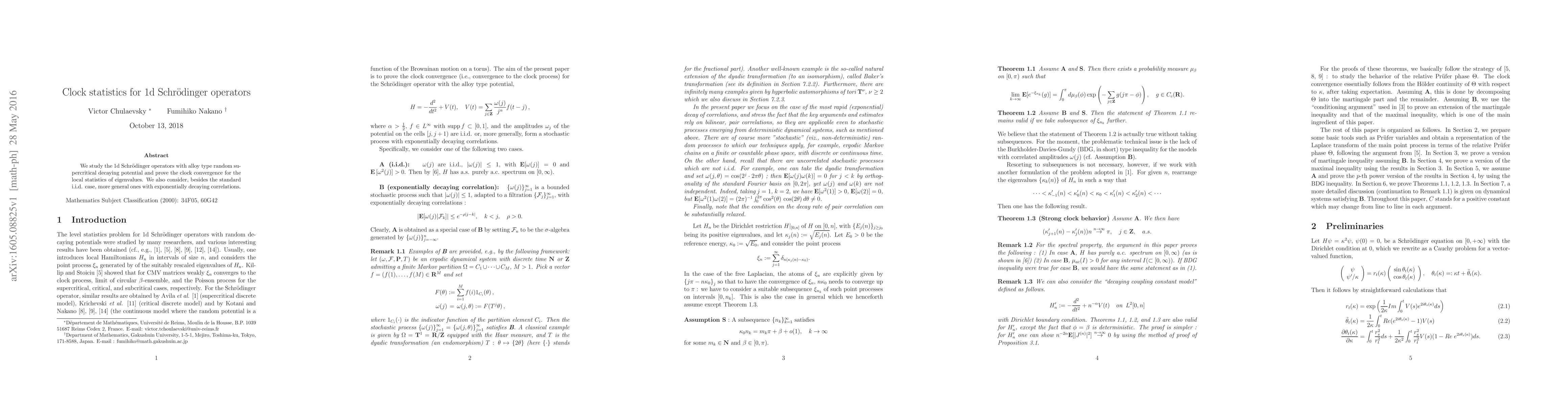 This research is significant as it advances the understanding of clock statistics in 1D Schrödinger operators with random potentials, which has implications for spectral theory and mathematical physics.