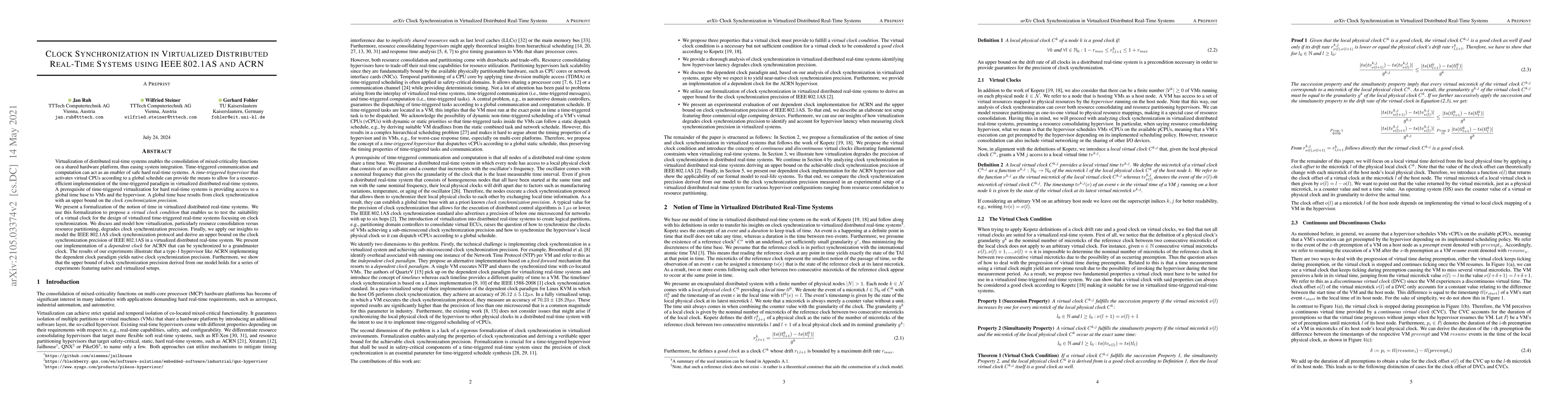 This paper proposes a formalization of time in virtualized real-time systems and introduces a virtual clock condition to assess clock synchronization accuracy. It models the IEEE 802.1AS protocol and demonstrates a dependent clock implementation in ACRN, achieving native synchronization precision, with experimental validation confirming the derived upper bound on synchronization precision.