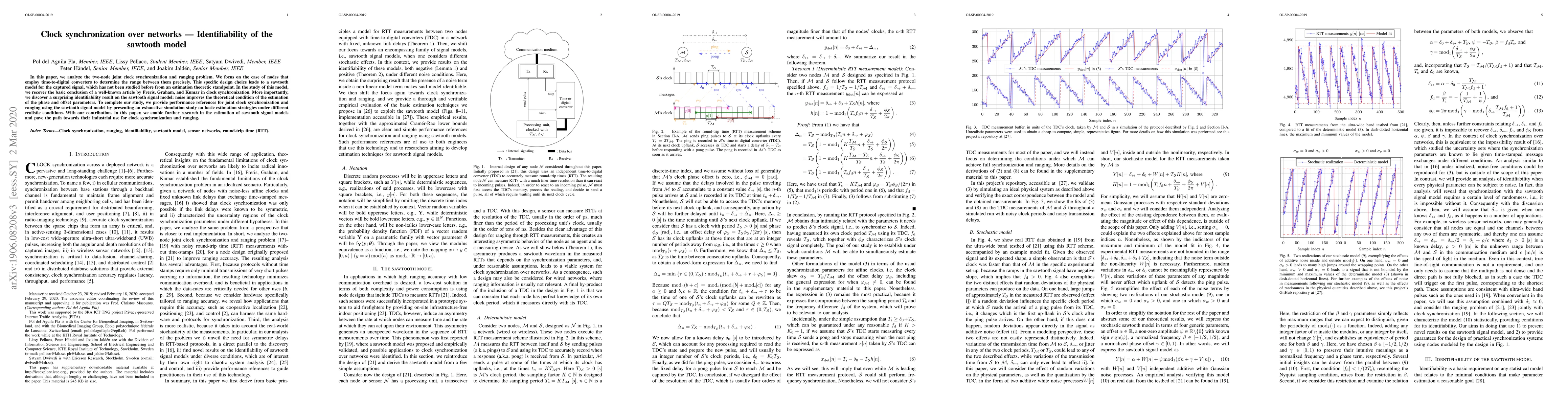 This paper investigates the two-node clock synchronization and ranging problem using time-to-digital converters, revealing a novel sawtooth signal model. It discovers that noise can actually improve the estimation of phase and offset parameters, a surprising identifiability result, and supports findings with extensive simulations.