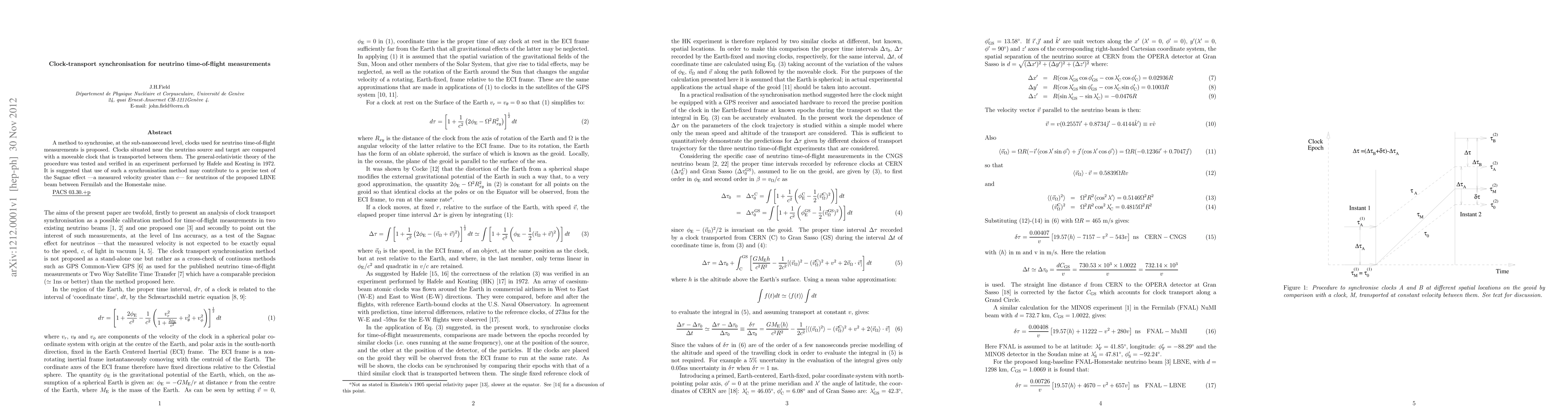 A method to synchronise, at the sub-nanosecond level, clocks used for neutrino time-of-flight measurements is proposed. Clocks situated near the neutrino source and target are compared with a moveable clock that is transported between them. The general-relativistic theory of the procedure was tested and verified in an experiment performed by Hafele and Keating in 1972. It is suggested that use of such a synchronisation method may contribute to a precise test of the Sagnac effect ---a measured velocity greater than $c$--- for neutrinos of the proposed LBNE beam between Fermilab and the Homestake mine.