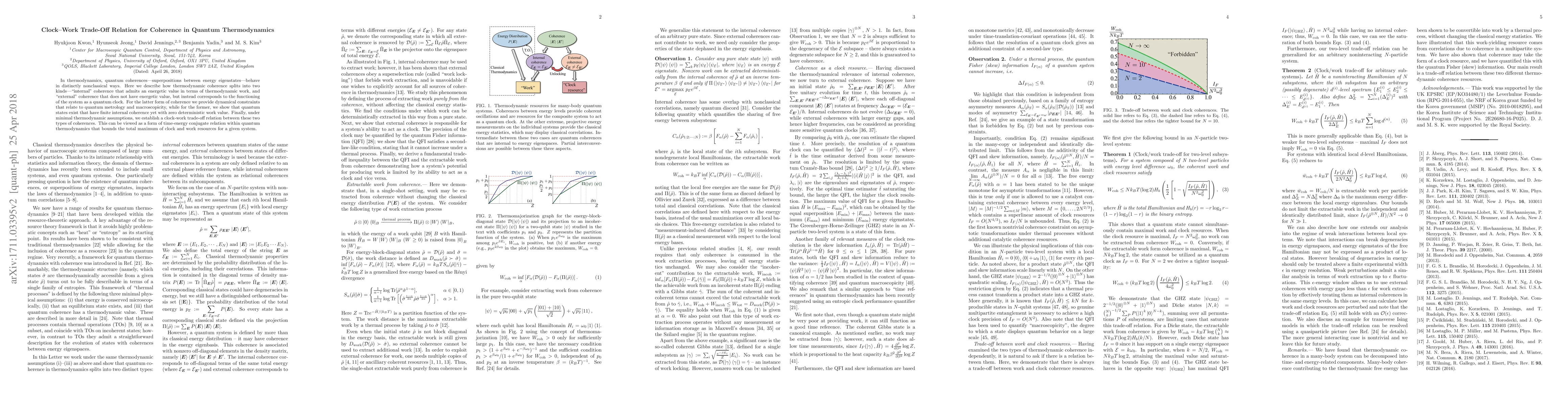 In thermodynamics, quantum coherences - superpositions between energy eigenstates - behave in distinctly nonclassical ways. Recently mathematical frameworks have emerged to account for these features and have provided a range of novel insights. Here we describe how thermodynamic coherence splits into two kinds - "internal" coherence that admits an energetic value in terms of thermodynamic work, and "external" coherence that does not have energetic value, but instead corresponds to the functioning of the system as a quantum clock. For the latter form of coherence we provide dynamical constraints that relate to quantum metrology and macroscopicity, while for the former, we show that quantum states exist that have finite internal coherence yet with zero deterministic work value. Finally, under minimal thermodynamic assumptions, we establish a clock/work tradeoff relation between these two types of coherences. This can be viewed as a form of time-energy conjugate relation within quantum thermodynamics that bounds the total maximum of clock and work resources for a given system.