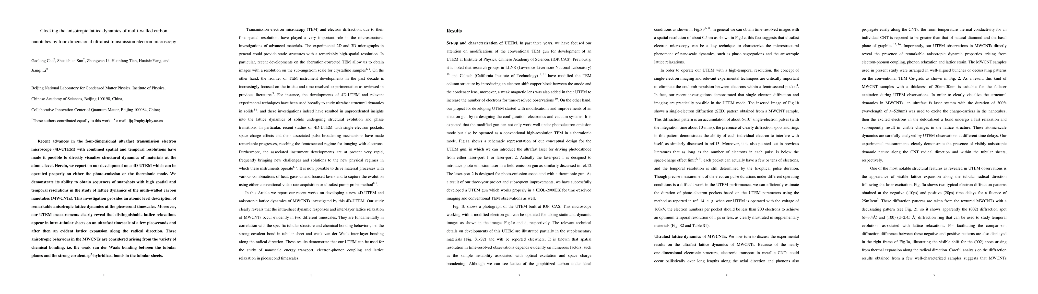 Recent advances in the four-dimensional ultrafast transmission electron microscope (4D-UTEM) with combined spatial and temporal resolutions have made it possible to directly visualize structural dynamics of materials at the atomic level. Herein, we report on our development on a 4D-UTEM which can be operated properly on either the photo-emission or the thermionic mode. We demonstrate its ability to obtain sequences of snapshots with high spatial and temporal resolutions in the study of lattice dynamics of the multi-walled carbon nanotubes (MWCNTs). This investigation provides an atomic level description of remarkable anisotropic lattice dynamics at the picosecond timescales. Moreover, our UTEM measurements clearly reveal that distinguishable lattice relaxations appear in intra-tubular sheets on an ultrafast timescale of a few picoseconds and after then an evident lattice expansion along the radical direction. These anisotropic behaviors in the MWCNTs are considered arising from the variety of chemical bonding, i.e. the weak van der Waals bonding between the tubular planes and the strong covalent sp2-hybridized bonds in the tubular sheets.