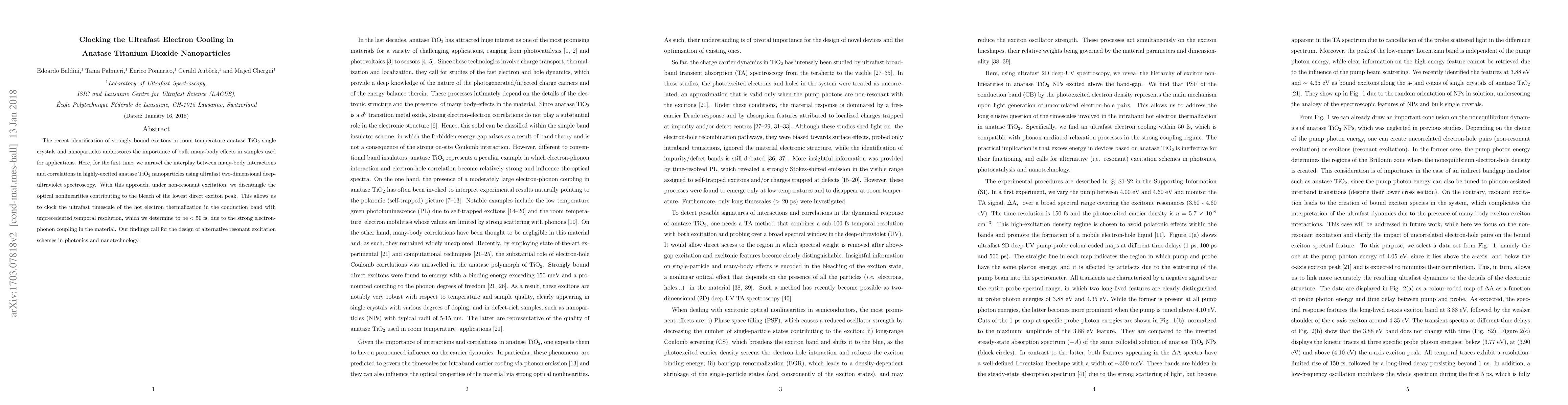The recent identification of strongly bound excitons in room temperature anatase TiO$_2$ single crystals and nanoparticles underscores the importance of bulk many-body effects in samples used for applications. Here, for the first time, we unravel the interplay between many-body interactions and correlations in highly-excited anatase TiO$_2$ nanoparticles using ultrafast two-dimensional deep-ultraviolet spectroscopy. With this approach, under non-resonant excitation, we disentangle the optical nonlinearities contributing to the bleach of the lowest direct exciton peak. This allows us to clock the ultrafast timescale of the hot electron thermalization in the conduction band with unprecedented temporal resolution, which we determine to be < 50 fs, due to the strong electron-phonon coupling in the material. Our findings call for the design of alternative resonant excitation schemes in photonics and nanotechnology.