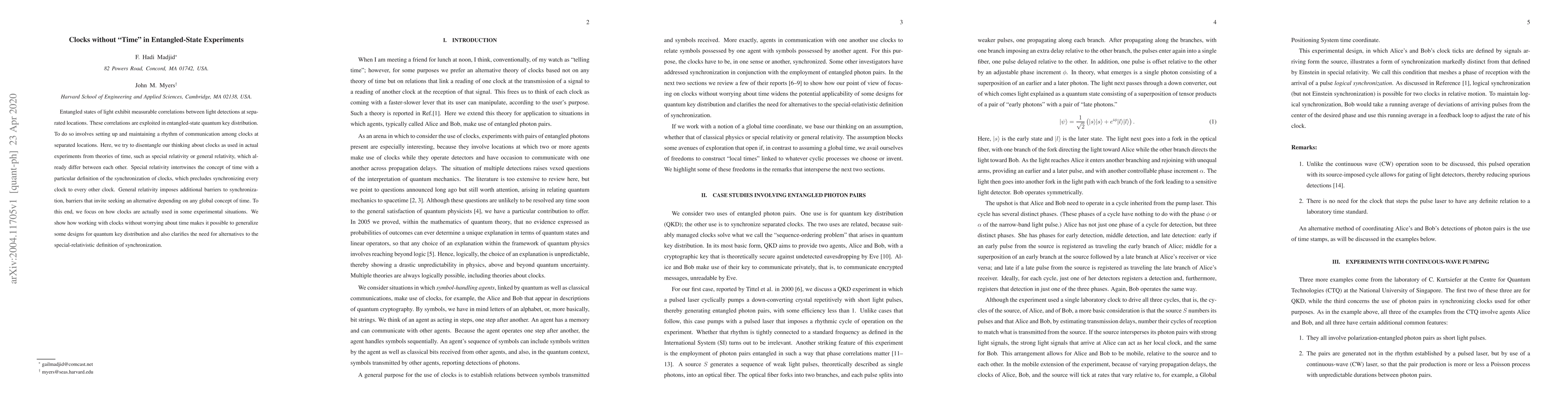 Entangled states of light exhibit measurable correlations between light detections at separated locations. These correlations are exploited in entangled-state quantum key distribution. To do so involves setting up and maintaining a rhythm of communication among clocks at separated locations. Here, we try to disentangle our thinking about clocks as used in actual experiments from theories of time, such as special relativity or general relativity, which already differ between each other. Special relativity intertwines the concept of time with a particular definition of the synchronization of clocks, which precludes synchronizing every clock to every other clock. General relativity imposes additional barriers to synchronization, barriers that invite seeking an alternative depending on any global concept of time. To this end, we focus on how clocks are actually used in some experimental situations. We show how working with clocks without worrying about time makes it possible to generalize some designs for quantum key distribution and also clarifies the need for alternatives to the special-relativistic definition of synchronization.