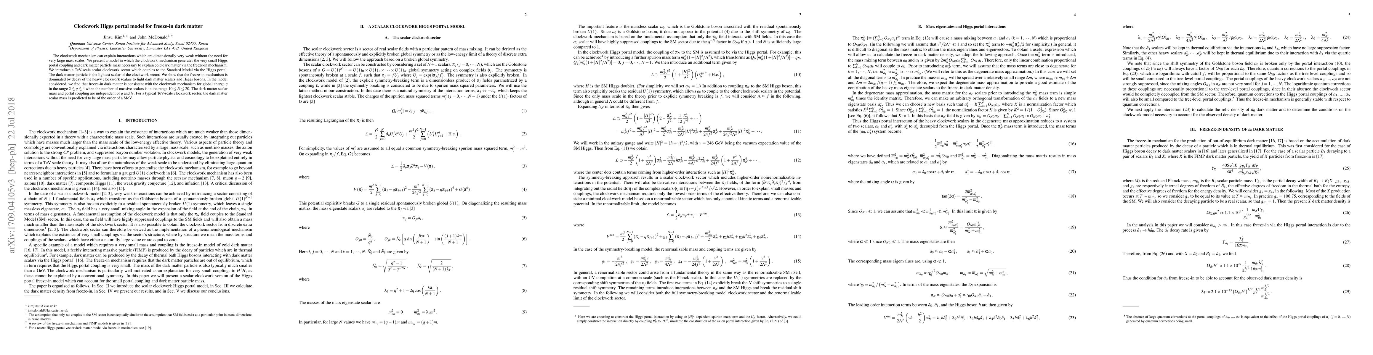 This paper proposes a clockwork Higgs portal model where the clockwork mechanism generates small Higgs portal couplings and dark matter masses, explaining cold dark matter via the freeze-in mechanism. The model predicts a TeV-scale scalar clockwork sector, with dark matter mass around a MeV, consistent for global charge $2 \lesssim q \lesssim 4$ and $10 \leq N \leq 20$ scalars.