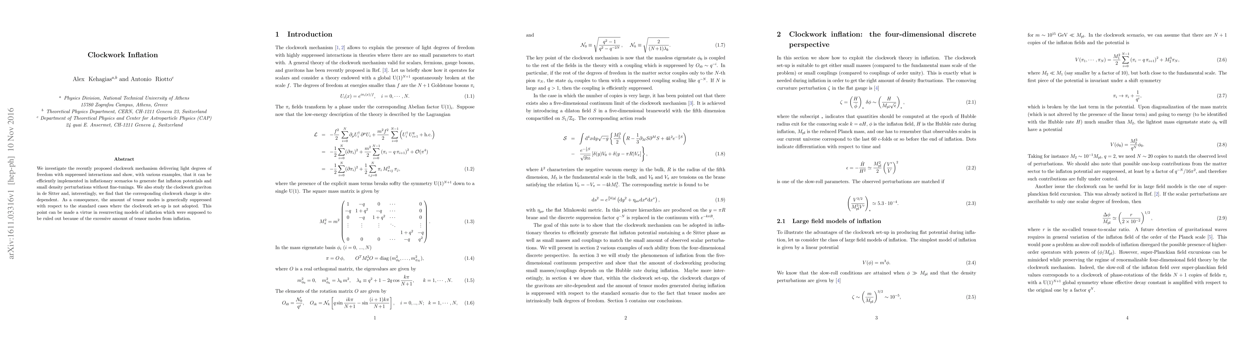 Title: Clockwork Inflation Summary: This paper explores the clockwork mechanism for generating light fields with weak interactions, demonstrating its application in inflation to produce flat inflaton potentials and suppressed tensor modes, potentially reviving certain inflationary models previously dismissed due to excessive tensor perturbations.