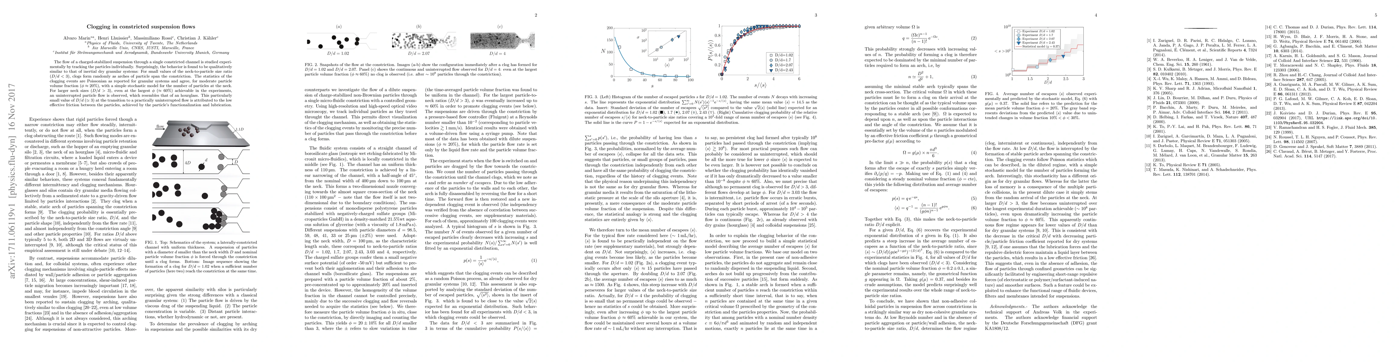 The flow of a charged-stabilized suspension through a single constricted channel is studied experimentally by tracking the particles individually. Surprisingly, the behavior is found to be qualitatively similar to that of inertial dry granular systems: For small values of the neck-to-particle size ratio (D/d<3), clogs form randomly as arches of particle span the constriction. The statistics of the clogging events are Poissonian as reported for granular systems and agree, for moderate particle volume fraction ($\phi\approx20\%$), with a simple stochastic model for the number of particles at the neck. For larger neck sizes (D/d>3), even at the largest $\phi$ ($\approx60\%$) achievable in the experiments, an uninterrupted particle flow is observed, which resembles that of an hourglass. This particularly small value of D/d at the transition to a practically uninterrupted flow is attributed to the low effective friction between the particles, achieved by the particle's functionalization and lubrication.