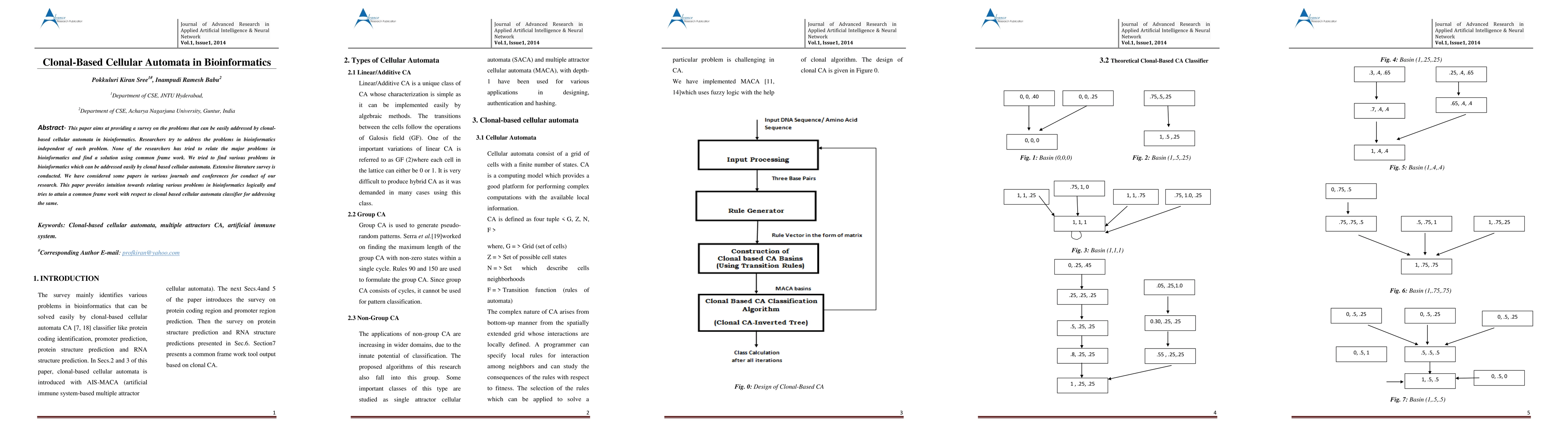 This paper aims at providing a survey on the problems that can be easily addressed by clonalbased cellular automata in bioinformatics. Researchers try to address the problems in bioinformatics independent of each problem. None of the researchers has tried to relate the major problems in bioinformatics and find a solution using common frame work. We tried to find various problems in bioinformatics which can be addressed easily by clonal based cellular automata. Extensive literature survey is conducted. We have considered some papers in various journals and conferences for conduct of our research. This paper provides intuition towards relating various problems in bioinformatics logically and tries to attain a common frame work with respect to clonal based cellular automata classifier for addressing the same.