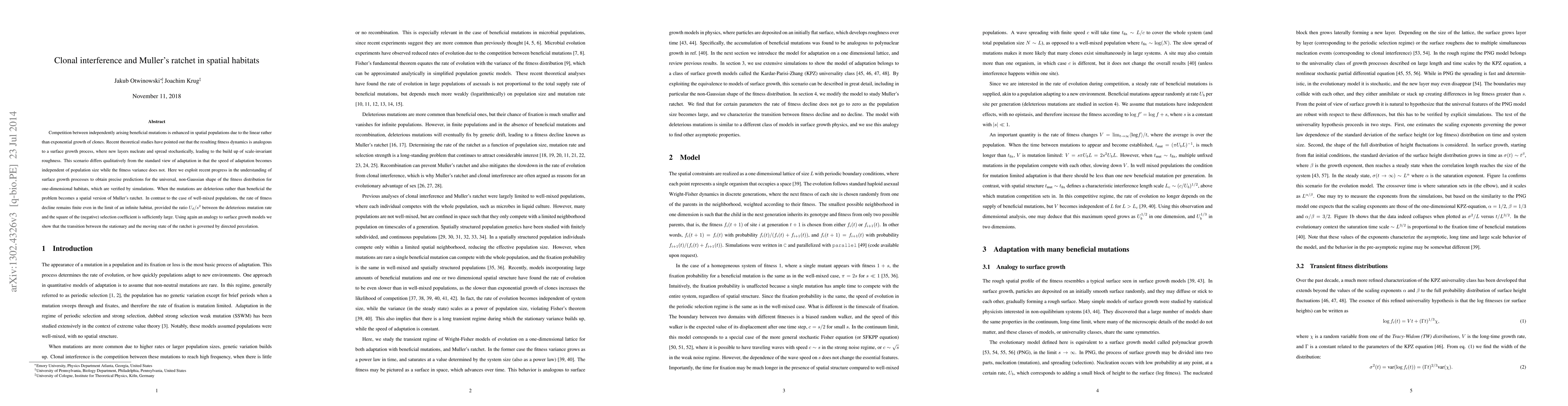 Competition between independently arising beneficial mutations is enhanced in spatial populations due to the linear rather than exponential growth of clones. Recent theoretical studies have pointed out that the resulting fitness dynamics is analogous to a surface growth process, where new layers nucleate and spread stochastically, leading to the build up of scale-invariant roughness. This scenario differs qualitatively from the standard view of adaptation in that the speed of adaptation becomes independent of population size while the fitness variance does not. Here we exploit recent progress in the understanding of surface growth processes to obtain precise predictions for the universal, non-Gaussian shape of the fitness distribution for one-dimensional habitats, which are verified by simulations. When the mutations are deleterious rather than beneficial the problem becomes a spatial version of Muller's ratchet. In contrast to the case of well-mixed populations, the rate of fitness decline remains finite even in the limit of an infinite habitat, provided the ratio $U_d/s^2$ between the deleterious mutation rate and the square of the (negative) selection coefficient is sufficiently large. Using again an analogy to surface growth models we show that the transition between the stationary and the moving state of the ratchet is governed by directed percolation.