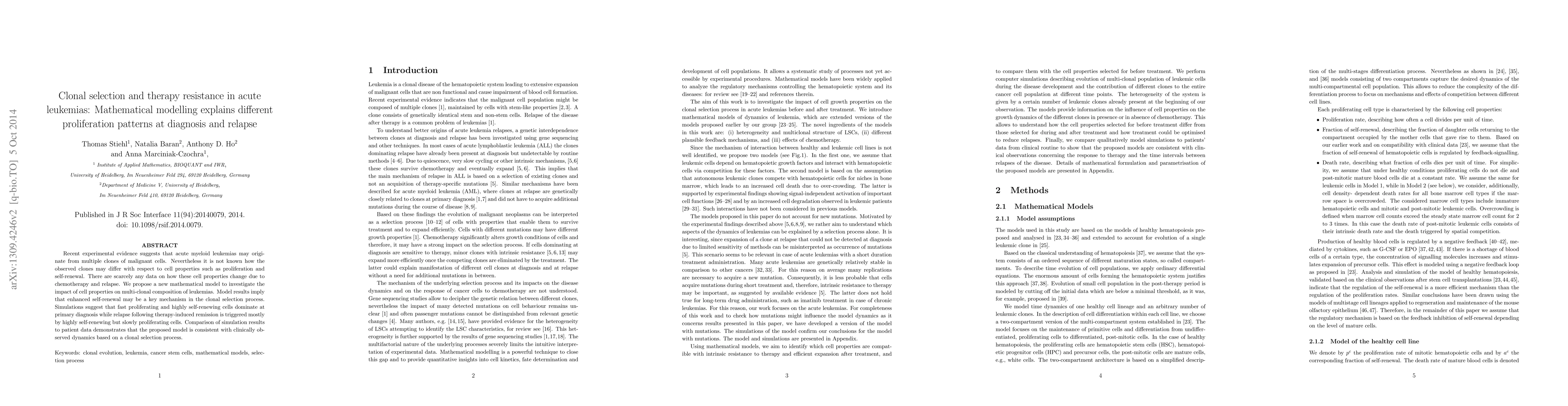 This paper proposes a mathematical model to explore how different clones of acute myeloid leukemia cells proliferate and self-renew, and how these properties influence clonal selection at diagnosis and relapse. The model suggests that highly self-renewing cells, even if they proliferate slowly, are key to therapy resistance and relapse.