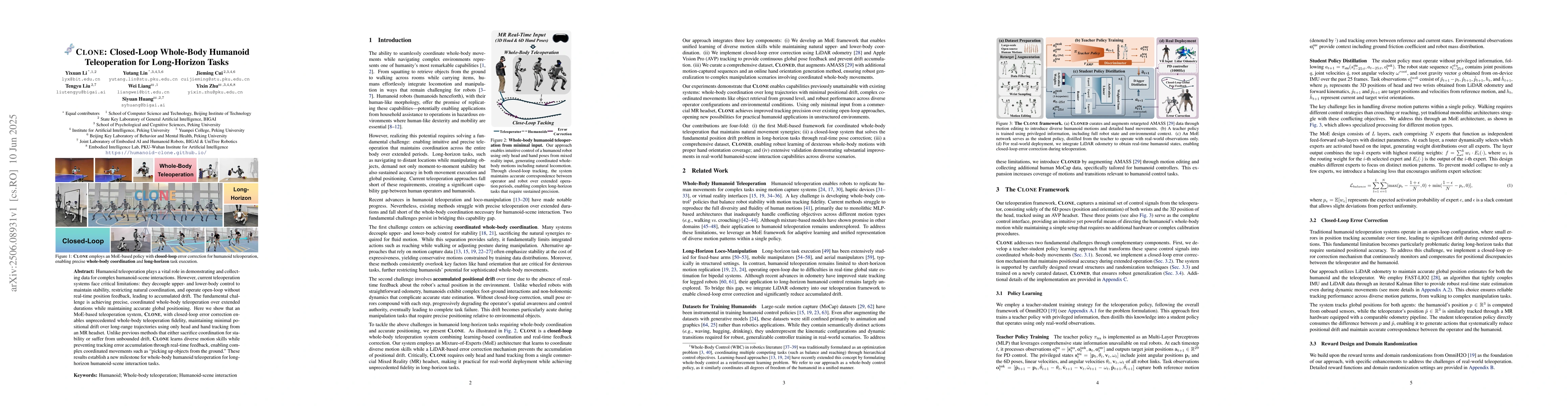 A new teleoperation system called CLONE enables precise whole-body control for long-distance humanoid interactions with minimal positional drift. It uses real-time feedback to learn diverse motion skills, overcoming previous limitations in coordination and stability.