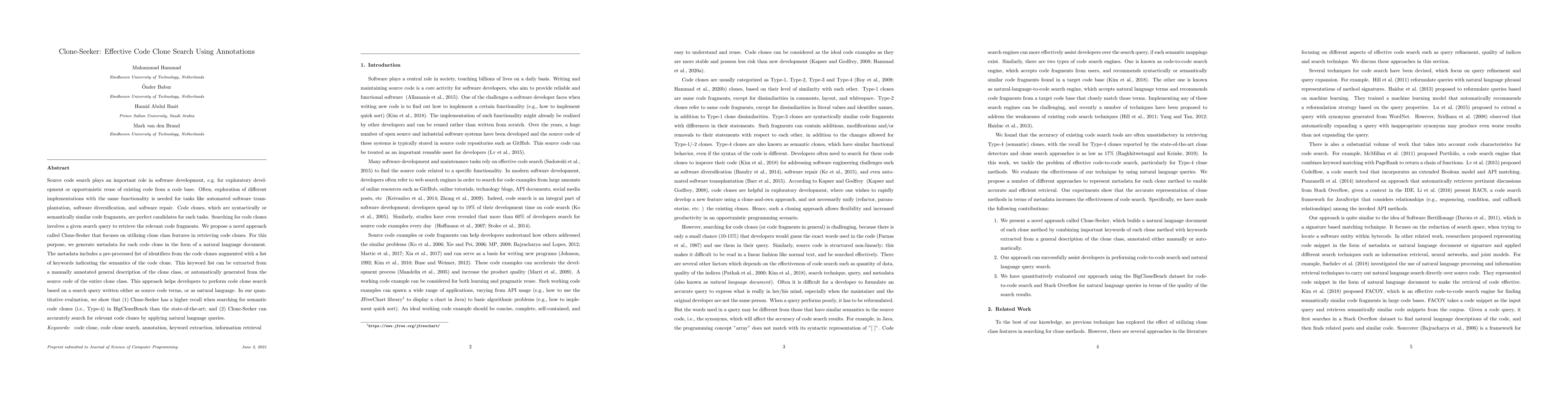 Clone-Seeker is a novel approach for effective code clone search that leverages metadata annotations to enhance search accuracy. It generates natural language documents for code clones, improving recall for semantic clone searches and enabling natural language query-based searches.