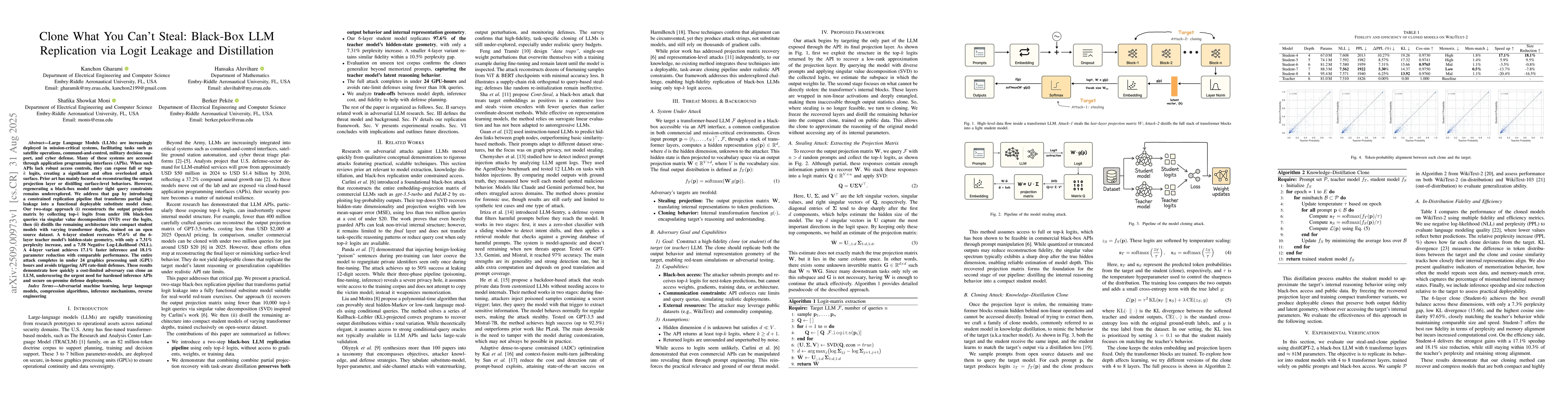 Large Language Models (LLMs) are increasingly deployed in mission-critical systems, facilitating tasks such as satellite operations, command-and-control, military decision support, and cyber defense. Many of these systems are accessed through application programming interfaces (APIs). When such APIs lack robust access controls, they can expose full or top-k logits, creating a significant and often overlooked attack surface. Prior art has mainly focused on reconstructing the output projection layer or distilling surface-level behaviors. However, regenerating a black-box model under tight query constraints remains underexplored. We address that gap by introducing a constrained replication pipeline that transforms partial logit leakage into a functional deployable substitute model clone. Our two-stage approach (i) reconstructs the output projection matrix by collecting top-k logits from under 10k black-box queries via singular value decomposition (SVD) over the logits, then (ii) distills the remaining architecture into compact student models with varying transformer depths, trained on an open source dataset. A 6-layer student recreates 97.6% of the 6-layer teacher model's hidden-state geometry, with only a 7.31% perplexity increase, and a 7.58 Negative Log-Likelihood (NLL). A 4-layer variant achieves 17.1% faster inference and 18.1% parameter reduction with comparable performance. The entire attack completes in under 24 graphics processing unit (GPU) hours and avoids triggering API rate-limit defenses. These results demonstrate how quickly a cost-limited adversary can clone an LLM, underscoring the urgent need for hardened inference APIs and secure on-premise defense deployments.