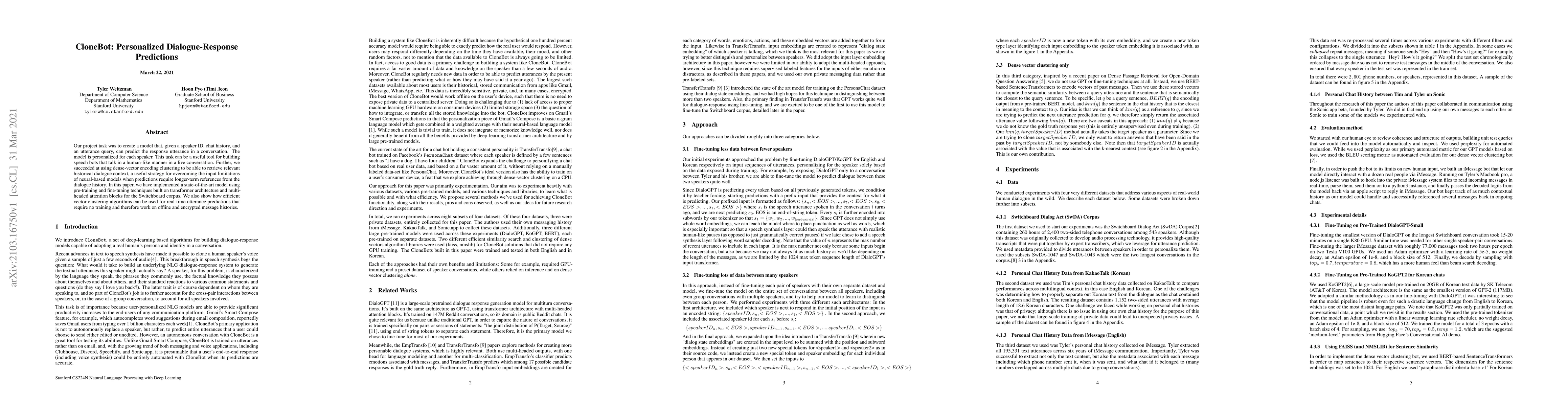 A model called CloneBot predicts responses in conversations based on speaker ID, chat history, and queries, using a personalized approach to improve human-like dialogue. It achieves state-of-the-art results with pre-training and fine-tuning techniques, enabling real-time predictions without training.