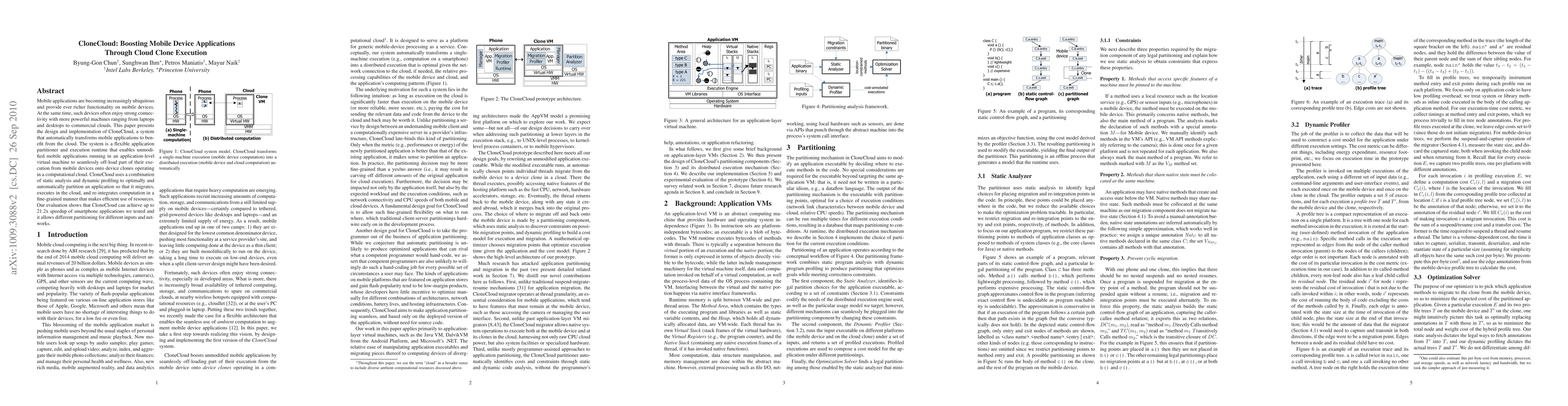 CloneCloud is a system designed to automatically transform mobile applications to leverage cloud resources, enabling offloading parts of their execution to cloud-based clones. It achieves up to 21.2x speedup for tested smartphone applications through flexible application partitioning and dynamic profiling.