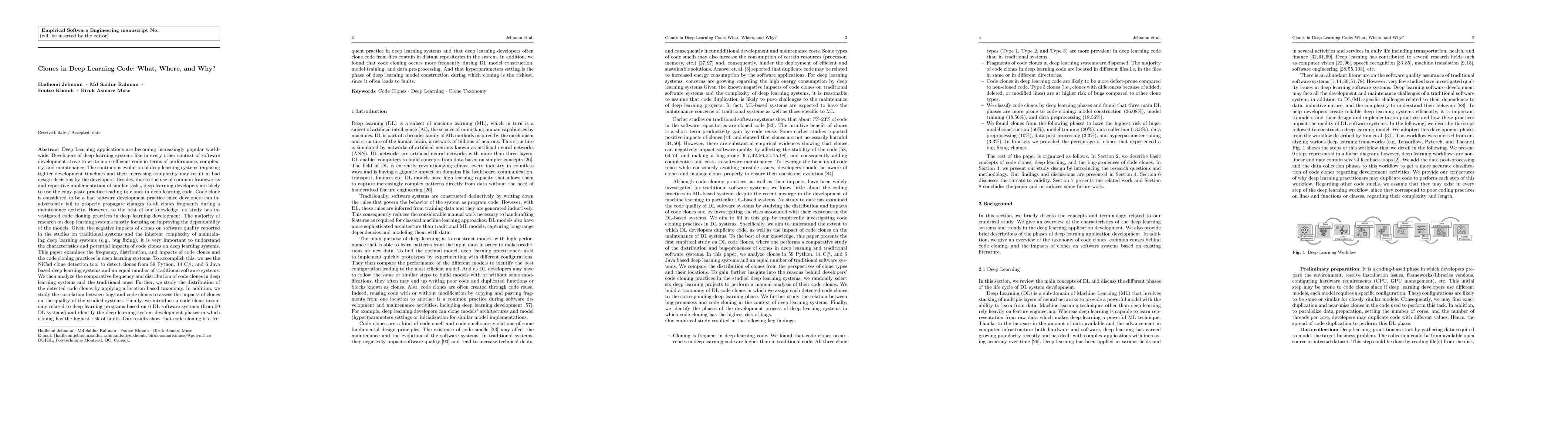 Deep Learning applications are becoming increasingly popular. Developers of deep learning systems strive to write more efficient code. Deep learning systems are constantly evolving, imposing tighter development timelines and increasing complexity, which may lead to bad design decisions. A copy-paste approach is widely used among deep learning developers because they rely on common frameworks and duplicate similar tasks. Developers often fail to properly propagate changes to all clones fragments during a maintenance activity. To our knowledge, no study has examined code cloning practices in deep learning development. Given the negative impacts of clones on software quality reported in the studies on traditional systems, it is very important to understand the characteristics and potential impacts of code clones on deep learning systems. To this end, we use the NiCad tool to detect clones from 59 Python, 14 C# and 6 Java-based deep learning systems and an equal number of traditional software systems. We then analyze the frequency and distribution of code clones in deep learning and traditional systems. We do further analysis of the distribution of code clones using location-based taxonomy. We also study the correlation between bugs and code clones to assess the impacts of clones on the quality of the studied systems. Finally, we introduce a code clone taxonomy related to deep learning programs and identify the deep learning system development phases in which cloning has the highest risk of faults. Our results show that code cloning is a frequent practice in deep learning systems and that deep learning developers often clone code from files in distant repositories in the system. In addition, we found that code cloning occurs more frequently during DL model construction. And that hyperparameters setting is the phase during which cloning is the riskiest, since it often leads to faults.