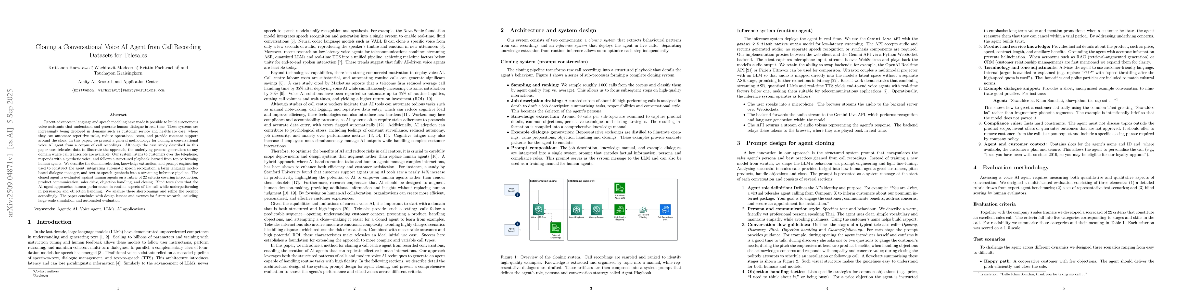 Recent advances in language and speech modelling have made it possible to build autonomous voice assistants that understand and generate human dialogue in real time. These systems are increasingly being deployed in domains such as customer service and healthcare care, where they can automate repetitive tasks, reduce operational costs, and provide constant support around the clock. In this paper, we present a general methodology for cloning a conversational voice AI agent from a corpus of call recordings. Although the case study described in this paper uses telesales data to illustrate the approach, the underlying process generalizes to any domain where call transcripts are available. Our system listens to customers over the telephone, responds with a synthetic voice, and follows a structured playbook learned from top performing human agents. We describe the domain selection, knowledge extraction, and prompt engineering used to construct the agent, integrating automatic speech recognition, a large language model based dialogue manager, and text to speech synthesis into a streaming inference pipeline. The cloned agent is evaluated against human agents on a rubric of 22 criteria covering introduction, product communication, sales drive, objection handling, and closing. Blind tests show that the AI agent approaches human performance in routine aspects of the call while underperforming in persuasion and objection handling. We analyze these shortcomings and refine the prompt accordingly. The paper concludes with design lessons and avenues for future research, including large scale simulation and automated evaluation.