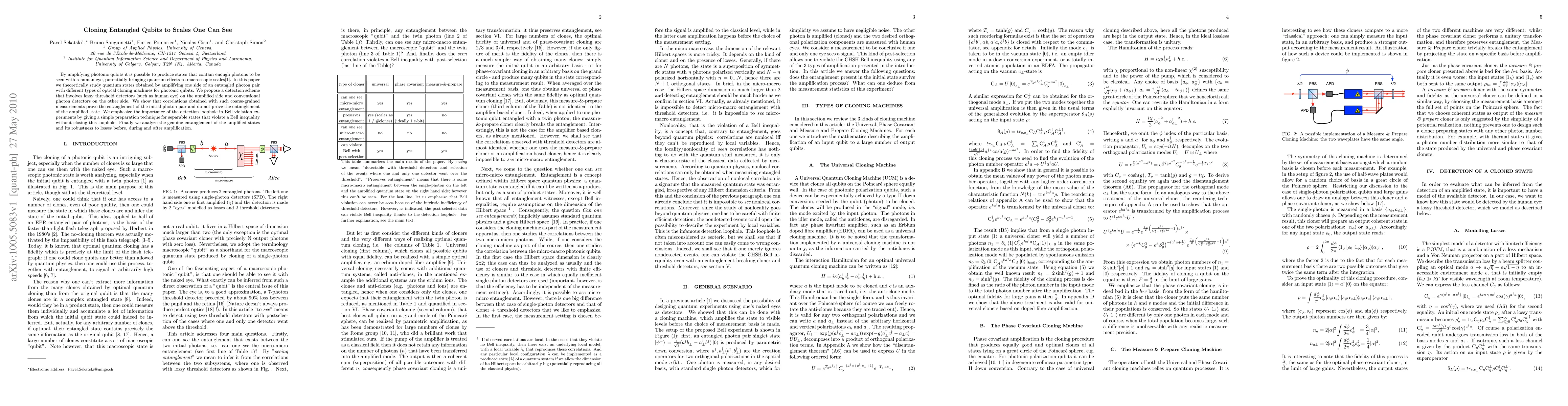 By amplifying photonic qubits it is possible to produce states that contain enough photons to be seen with a human eye, potentially bringing quantum effects to macroscopic scales [1]. In this paper we theoretically study quantum states obtained by amplifying one side of an entangled photon pair with different types of optical cloning machines for photonic qubits. We propose a detection scheme that involves lossy threshold detectors (such as human eye) on the amplified side and conventional photon detectors on the other side. We show that correlations obtained with such coarse-grained measurements prove the entanglement of the initial photon pair and do not prove the entanglement of the amplified state. We emphasize the importance of the detection loophole in Bell violation experiments by giving a simple preparation technique for separable states that violate a Bell inequality without closing this loophole. Finally we analyze the genuine entanglement of the amplified states and its robustness to losses before, during and after amplification.