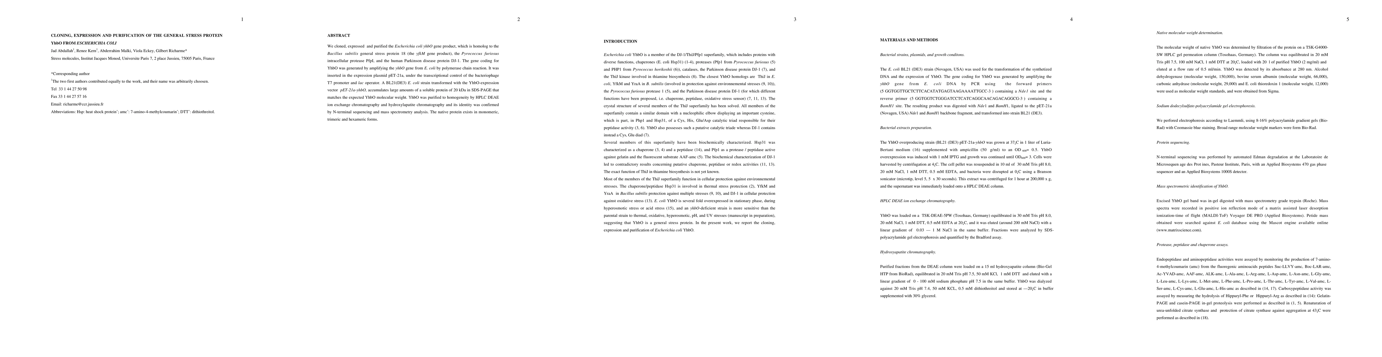 This paper details the cloning, expression, and purification of the Escherichia coli YhbO protein, a homolog to stress proteins and a Parkinson disease-related protein. The protein was successfully expressed in BL21(DE3) E. coli, purified to homogeneity, and confirmed to exist in monomeric, trimeric, and hexameric forms.