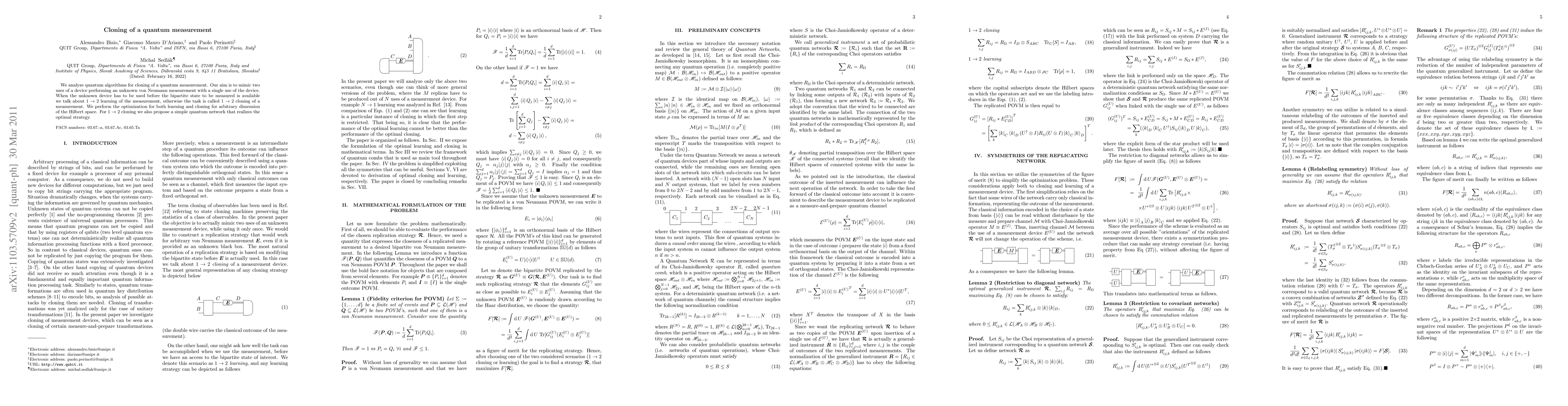 We analyze quantum algorithms for cloning of a quantum measurement. Our aim is to mimic two uses of a device performing an unknown von Neumann measurement with a single use of the device. When the unknown device has to be used before the bipartite state to be measured is available we talk about 1 -> 2 learning of the measurement, otherwise the task is called 1 -> 2 cloning of a measurement. We perform the optimization for both learning and cloning for arbitrary dimension of the Hilbert space. For 1 -> 2 cloning we also propose a simple quantum network that realizes the optimal strategy.