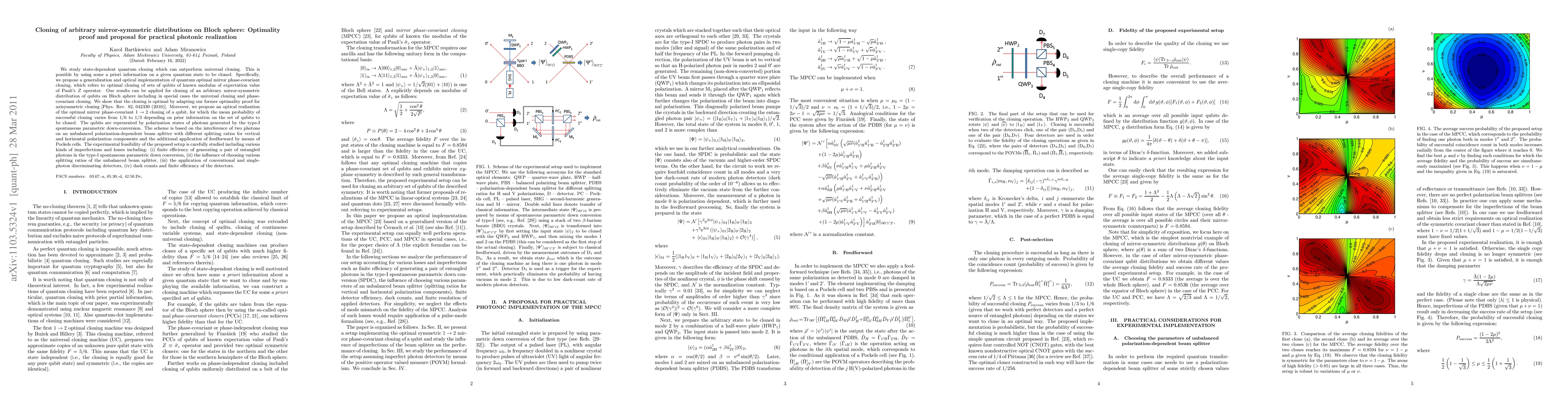 This paper proposes an optimal method for cloning mirror-symmetric quantum states on the Bloch sphere, leveraging prior information to outperform universal cloning. It introduces an optical implementation for 1-to-2 cloning of qubits using photon polarization states, detailing the experimental setup and addressing potential imperfections and losses.