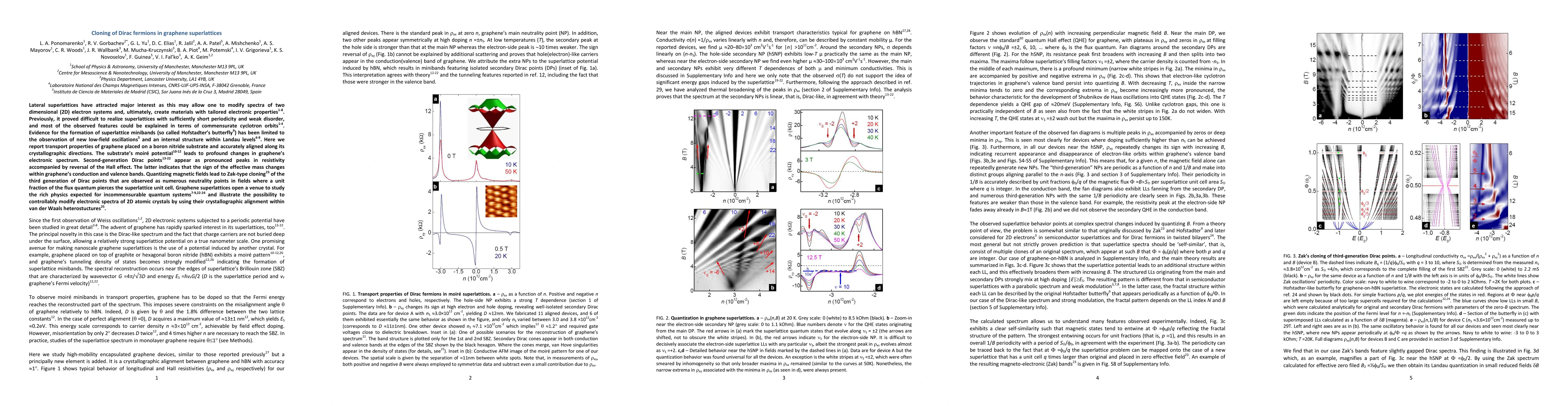 The study reports on the formation of Dirac fermions in graphene superlattices created by aligning graphene on a boron nitride substrate, resulting in significant changes in the electronic spectrum and the emergence of second-generation Dirac points. The cloning of third-generation Dirac points under quantizing magnetic fields demonstrates the potential to tailor electronic properties in 2D atomic crystals through precise crystallographic alignment.