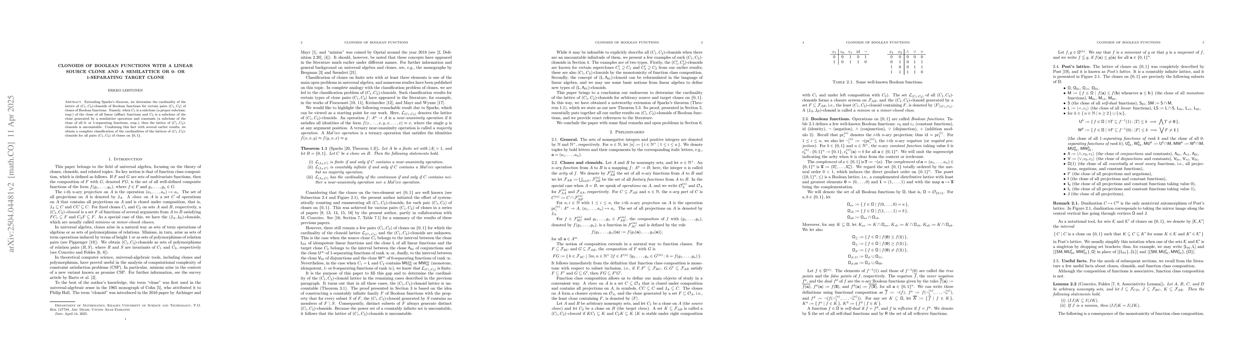 The research extends Sparks's theorem to determine the cardinality of the lattice of (C1,C2)-clonoids of Boolean functions for specific pairs (C1,C2) of clones, using subclones of linear/affine functions and semilattice/0- or 1-separating functions as source and target clones.
