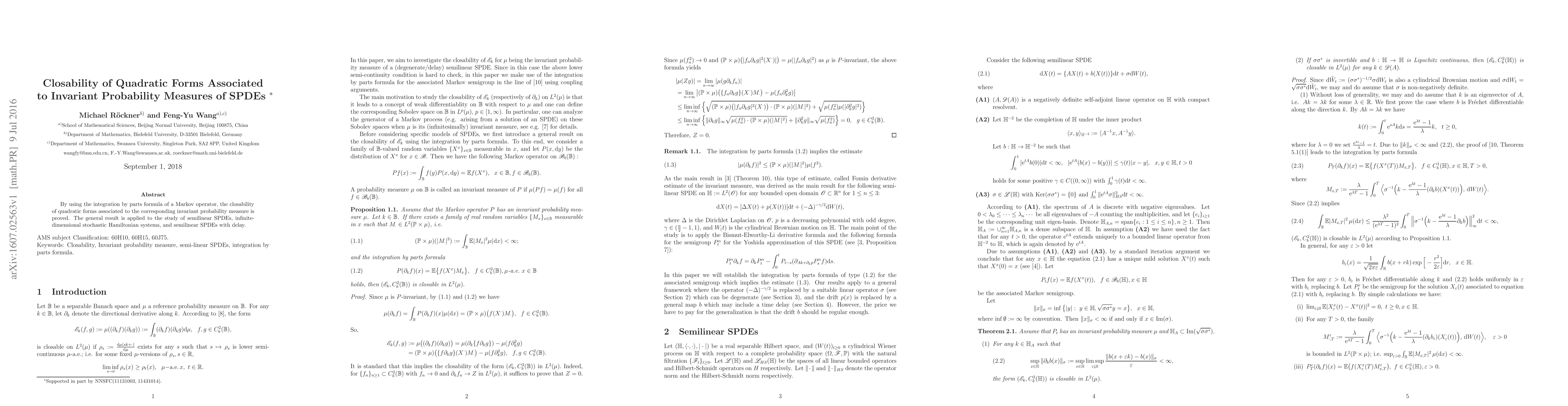 Researchers prove that certain quadratic forms associated with invariant probability measures of stochastic partial differential equations (SPDEs) can be closed, a finding with implications for the study of semilinear SPDEs and infinite-dimensional stochastic Hamiltonian systems.