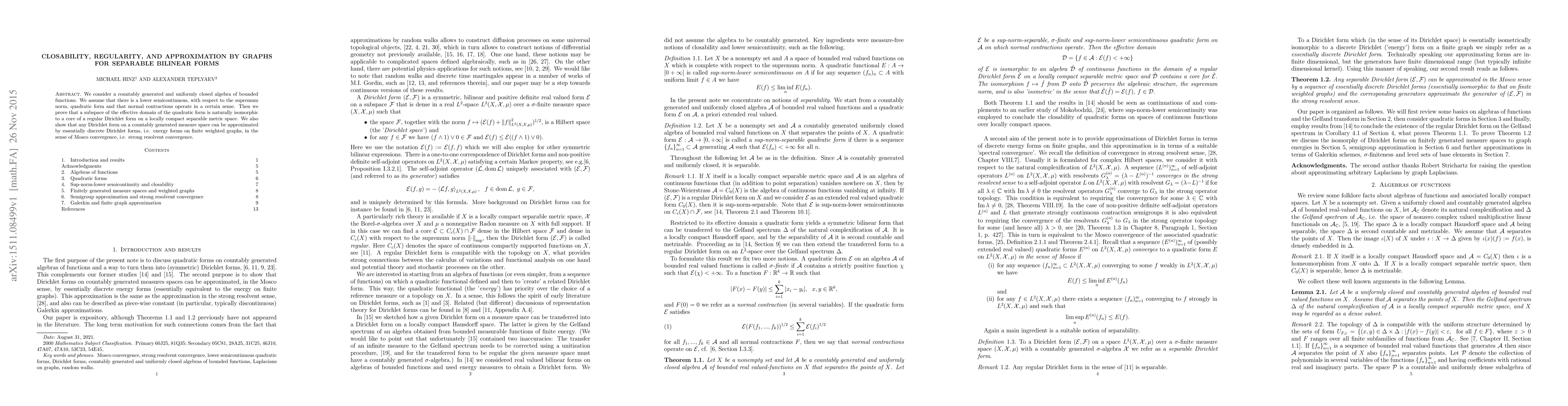 We consider a countably generated and uniformly closed algebra of bounded functions. We assume that there is a lower semicontinuous, with respect to the supremum norm, quadratic form and that normal contractions operate in a certain sense. Then we prove that a subspace of the effective domain of the quadratic form is naturally isomorphic to a core of a regular Dirichlet form on a locally compact separable metric space. We also show that any Dirichlet form on a countably generated measure space can be approximated by essentially discrete Dirichlet forms, i.e. energy forms on finite weighted graphs, in the sense of Mosco convergence, i.e. strong resolvent convergence.