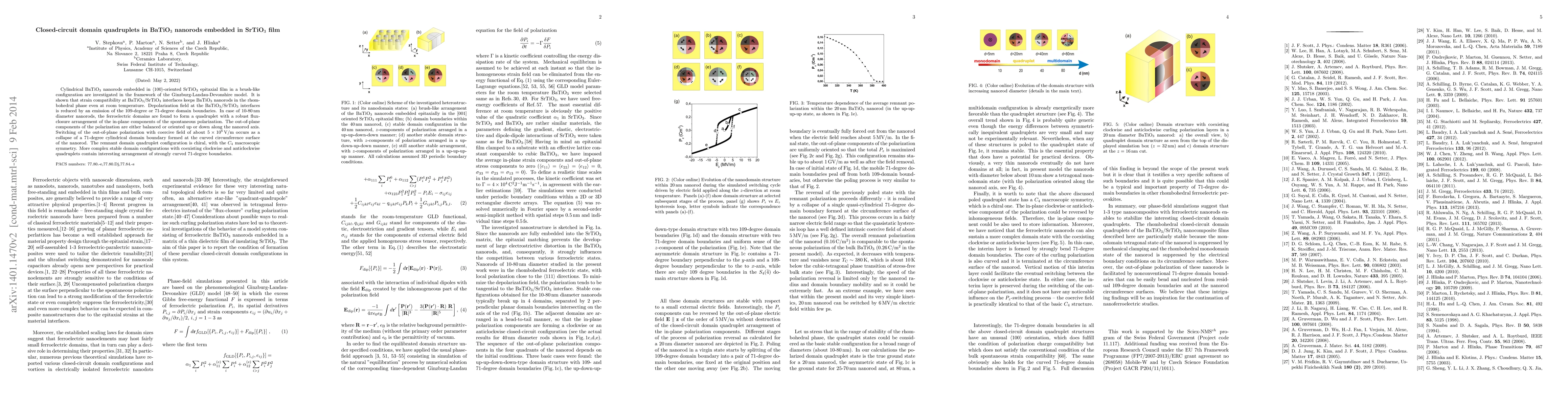 Cylindrical BaTiO3 nanorods embedded in (100)-oriented SrTiO3 epitaxial film in a brush-like configuration are investigated in the framework of the Ginzburg-Landau-Devonshire model. It is shown that strain compatibility at BaTiO3/SrTiO3 interfaces keeps BaTiO3 nanorods in the rhombohedral phase even at room temperature. Depolarization field at the BaTiO3/SrTiO3 interfaces is reduced by an emission of the 109-degree or 71-degree domain boundaries. In case of nanorods of about 10-80 nm diameter, the ferroelectric domains are found to form a quadruplet with a robust flux-closure arrangement of the in-plane components of the spontaneous polarization. The out-of-plane components of the polarization are either balanced or oriented up or down along the nanorod axis. Switching of the out-of-plane polarization with coercive field of about $5.10^6$ V/m occurs as a collapse of a 71-degree cylindrical domain boundary formed at the curved circumference surface of the nanorod. The remnant domain quadruplet configuration is chiral, with the $C_4$ macroscopic symmetry. More complex stable domain configurations with coexisting clockwise and anticlockwise quadruplets contain interesting arrangement of strongly curved 71-degree boundaries.
