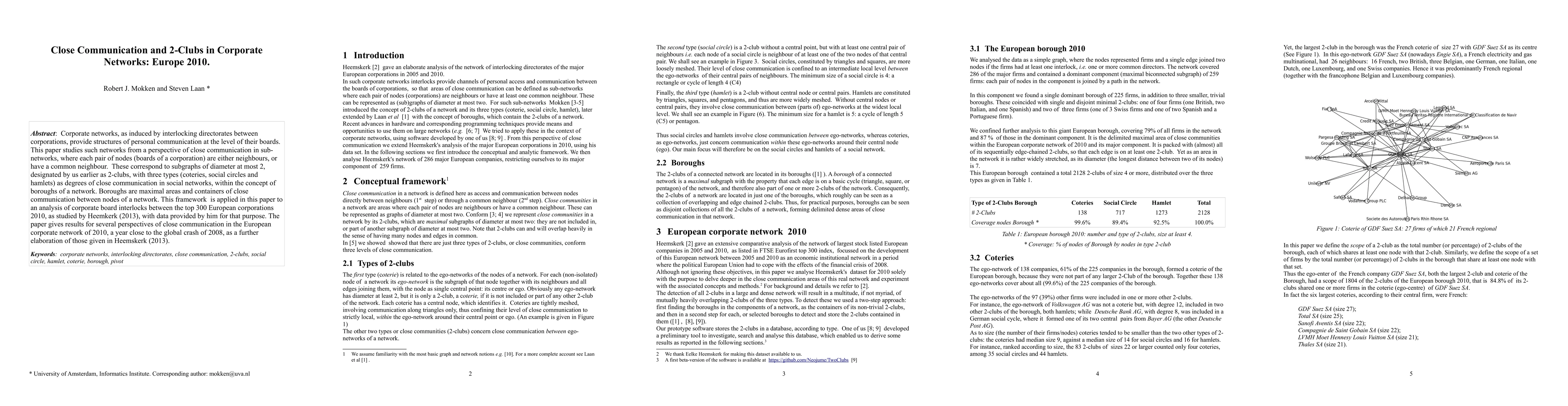 This paper analyzes corporate networks in Europe in 2010, focusing on "2-clubs" — sub-networks where any two nodes are either neighbors or share a common neighbor, representing close communication. It categorizes these into coterie, social circle, and hamlet types, and applies this framework to board interlocks among the top 300 European corporations, providing insights into communication structures post-2008 financial crash.