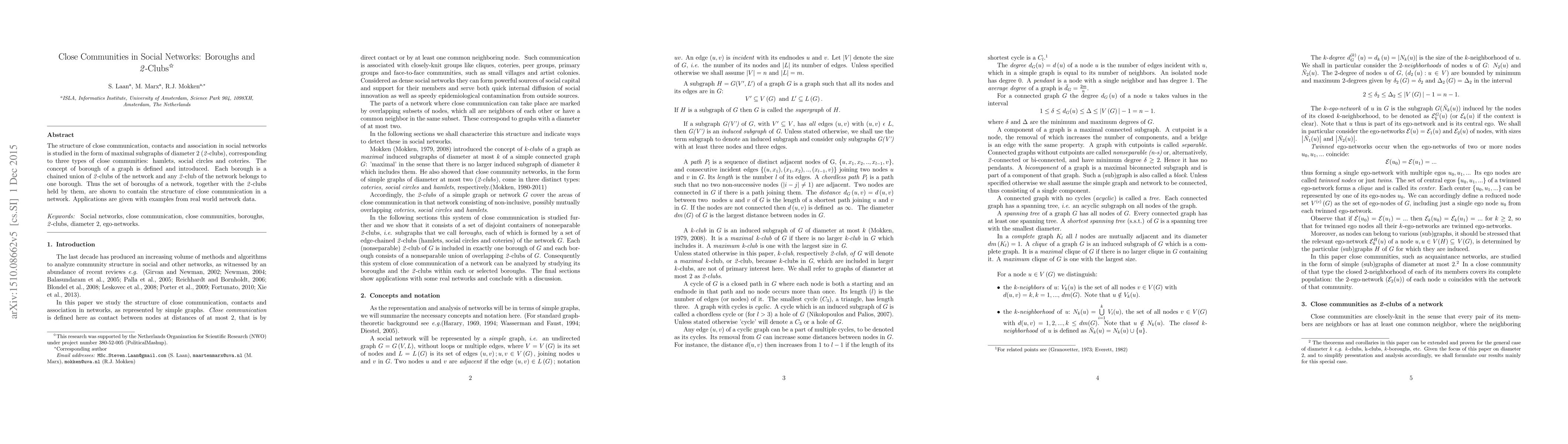 This paper investigates the structure of close communication in social networks through maximal subgraphs of diameter 2, termed 2-clubs, which represent hamlets, social circles, and coterie communities. It introduces the concept of a "borough" of a graph, a union of 2-clubs, and demonstrates how these boroughs encapsulate the network's close communication structure, illustrated with real-world data examples.
