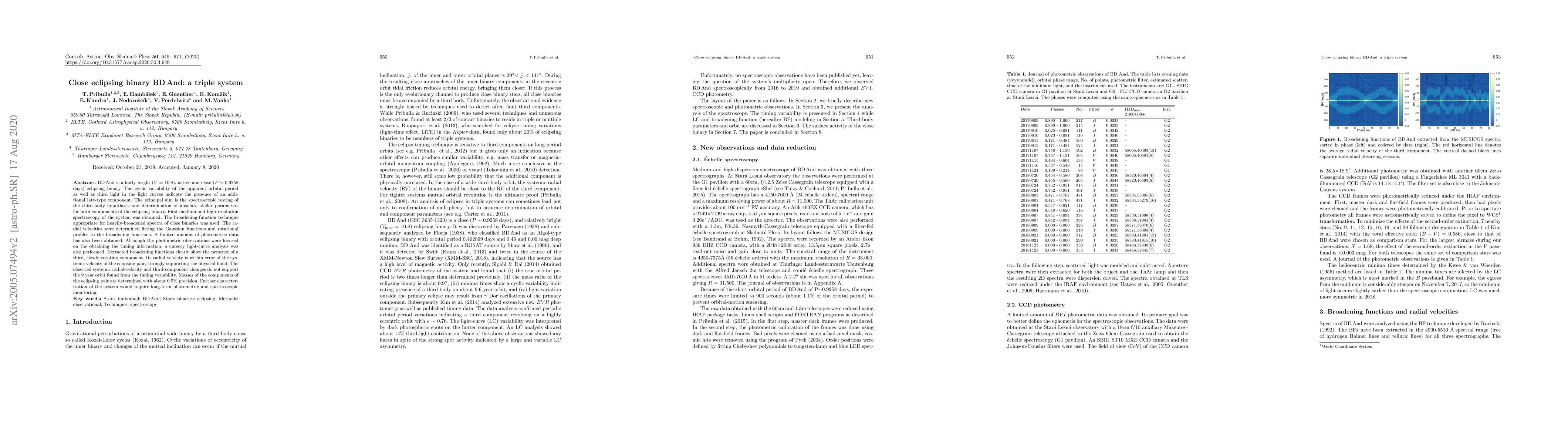 BD And is identified as a close eclipsing binary with an additional late-type component, forming a triple system. Spectroscopic analysis confirms the presence of this third component, and precise masses for the binary pair are determined, though long-term monitoring is needed for further characterization.