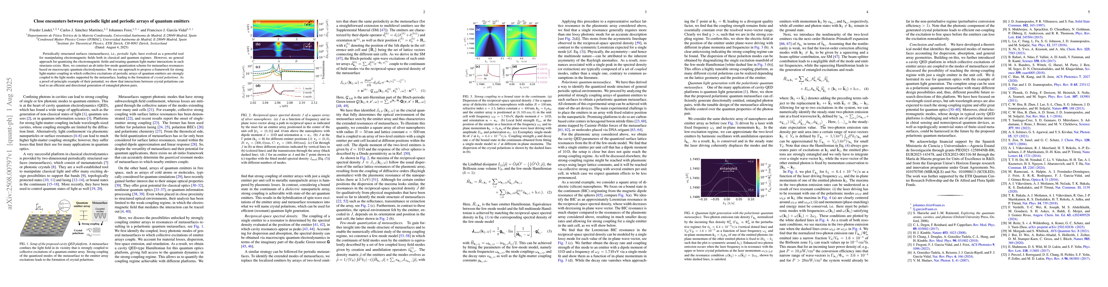 Periodically structured surfaces (metasurfaces), i.e., periodic light, have evolved as a powerful tool for manipulating electromagnetic fields both in classical and quantum regimes. However, no general approach for quantizing the electromagnetic fields and treating quantum light-matter interactions in such structures exists. Here, we construct an ab initio few-mode quantization scheme for metasurface resonances based on macroscopic quantum electrodynamics. We use our approach to propose a framework for strong light-matter coupling in which collective excitations of periodic arrays of quantum emitters are strongly coupled to the light modes supported by the metasurface, leading to the formation of crystal polaritons. As a proof-of-principle example of their potential, we show that interactions between crystal polaritons can lead to an efficient and directional generation of entangled photon pairs.