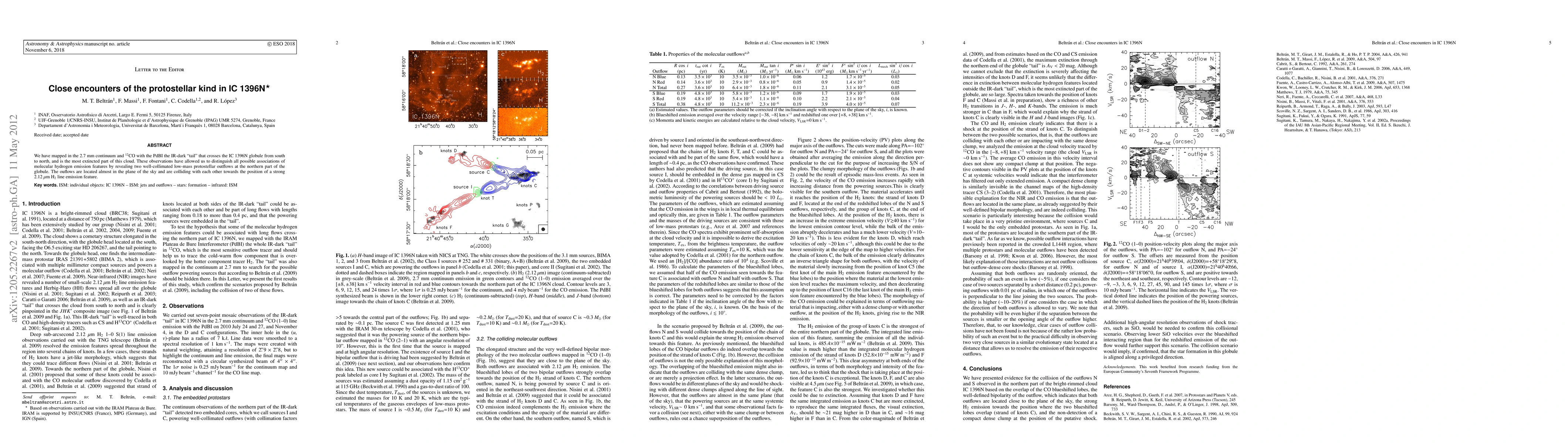 We have mapped in the 2.7 mm continuum and 12CO with the PdBI the IR-dark "tail" that crosses the IC 1396N globule from south to north, and is the most extincted part of this cloud. These observations have allowed us to distinguish all possible associations of molecular hydrogen emission features by revealing the presence of two well-collimated low-mass protostellar outflows at the northern part of the globule. The outflows are located almost in the plane of the sky and are colliding with each other towards the position of a strong 2.12 microns H2 line emission feature.