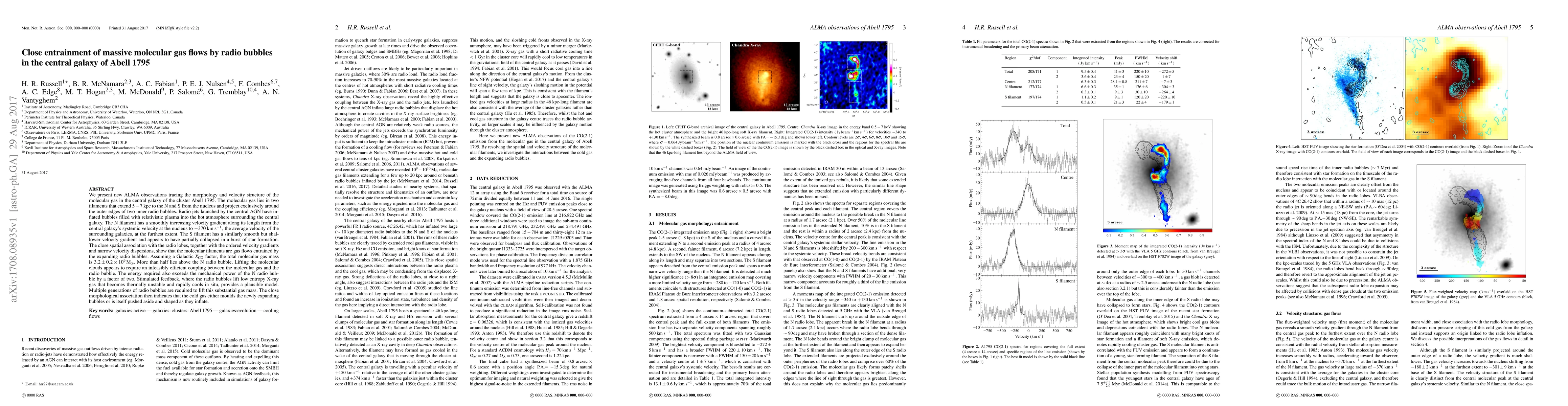 We present new ALMA observations tracing the morphology and velocity structure of the molecular gas in the central galaxy of the cluster Abell 1795. The molecular gas lies in two filaments that extend 5 - 7 kpc to the N and S from the nucleus and project exclusively around the outer edges of two inner radio bubbles. Radio jets launched by the central AGN have inflated bubbles filled with relativistic plasma into the hot atmosphere surrounding the central galaxy. The N filament has a smoothly increasing velocity gradient along its length from the central galaxy's systemic velocity at the nucleus to -370 km/s, the average velocity of the surrounding galaxies, at the furthest extent. The S filament has a similarly smooth but shallower velocity gradient and appears to have partially collapsed in a burst of star formation. The close spatial association with the radio lobes, together with the ordered velocity gradients and narrow velocity dispersions, show that the molecular filaments are gas flows entrained by the expanding radio bubbles. Assuming a Galactic $X_{\mathrm{CO}}$ factor, the total molecular gas mass is $3.2\pm0.2\times10^{9}$M$_{\odot}$. More than half lies above the N radio bubble. Lifting the molecular clouds appears to require an infeasibly efficient coupling between the molecular gas and the radio bubble. The energy required also exceeds the mechanical power of the N radio bubble by a factor of two. Stimulated feedback, where the radio bubbles lift low entropy X-ray gas that becomes thermally unstable and rapidly cools in situ, provides a plausible model. Multiple generations of radio bubbles are required to lift this substantial gas mass. The close morphological association then indicates that the cold gas either moulds the newly expanding bubbles or is itself pushed aside and shaped as they inflate.