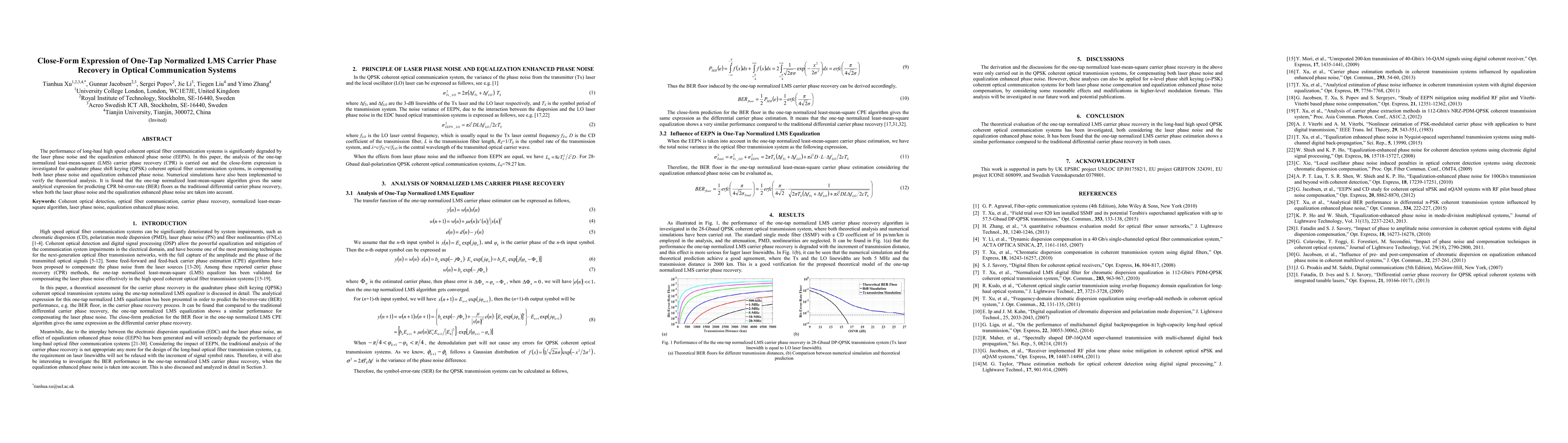 The performance of long-haul high speed coherent optical fiber communication systems is significantly degraded by the laser phase noise and the equalization enhanced phase noise (EEPN). In this paper, the analysis of the one-tap normalized least-mean-square (LMS) carrier phase recovery (CPR) is carried out and the close-form expression is investigated for quadrature phase shift keying (QPSK) coherent optical fiber communication systems, in compensating both laser phase noise and equalization enhanced phase noise. Numerical simulations have also been implemented to verify the theoretical analysis. It is found that the one-tap normalized least-mean-square algorithm gives the same analytical expression for predicting CPR bit-error-rate (BER) floors as the traditional differential carrier phase recovery, when both the laser phase noise and the equalization enhanced phase noise are taken into account.