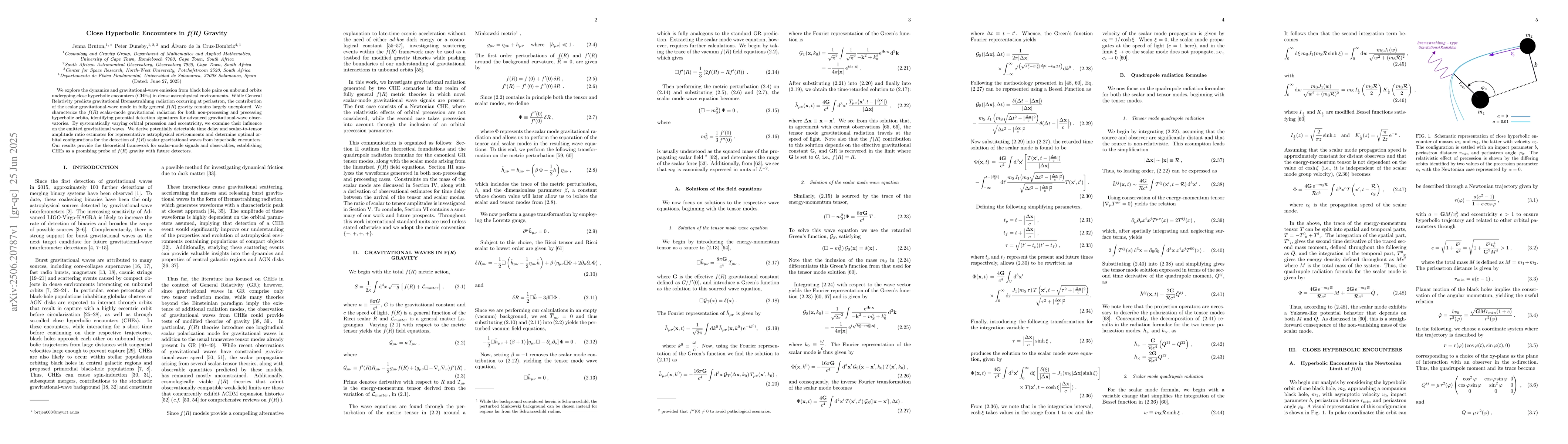 We explore the dynamics and gravitational-wave emission from black hole pairs on unbound orbits undergoing close hyperbolic encounters (CHEs) in dense astrophysical environments. While General Relativity predicts gravitational Bremsstrahlung radiation occurring at periastron, the contribution of the scalar gravitational-wave mode in fully general f(R) gravity remains largely unexplored. We characterize the f(R) scalar mode gravitational radiation for both non-precessing and precessing hyperbolic orbits, identifying potential detection signatures for advanced gravitational wave observatories. By systematically varying orbital precession and eccentricity, we examine their influence on the emitted gravitational waves. We derive potentially detectable time delay and scalar-to-tensor amplitude ratio estimates for representative astrophysical environments and determine optimal orbital configurations for the detection of f(R) scalar gravitational waves from hyperbolic encounters. Our results provide a theoretical framework for scalar-mode signals and observables, establishing CHEs as a promising probe of f(R) gravity with future detectors.