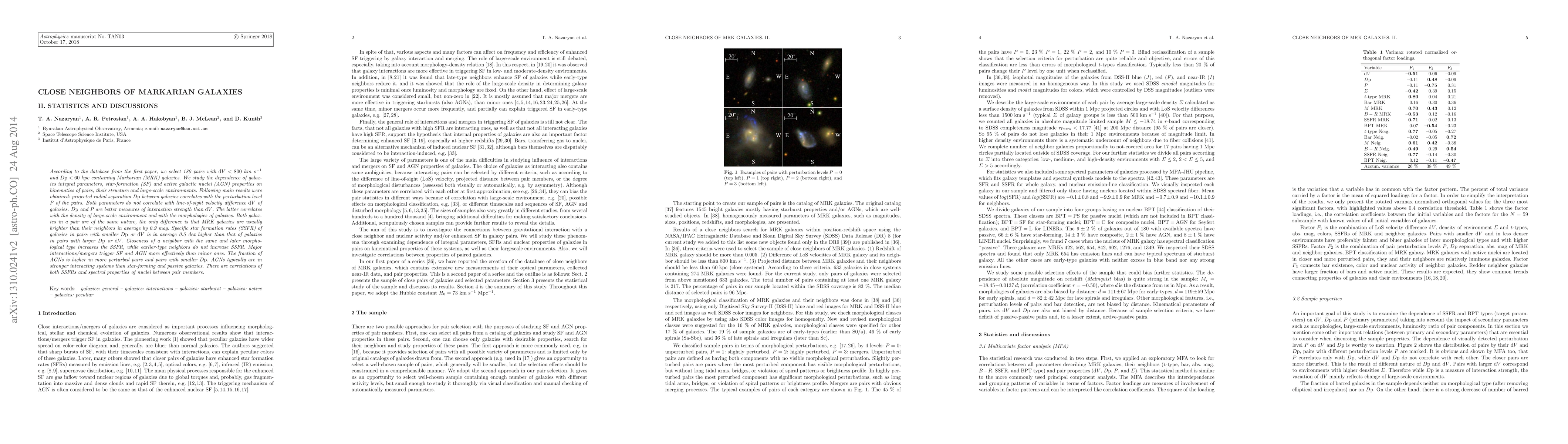 According to the database from the first paper, we select 180 pairs with dV < 800 km/s and Dp < 60 kpc containing Markarian (MRK) galaxies. We study the dependence of galaxies integral parameters, star-formation (SF) and active galactic nuclei (AGN) properties on kinematics of pairs, their structure and large-scale environments. Following main results were obtained: projected radial separation Dp between galaxies correlates with the perturbation level P of the pairs. Both parameters do not correlate with line-of-sight velocity difference dV of galaxies. Dp and P are better measures of interaction strength than dV. The latter correlates with the density of large-scale environment and with the morphologies of galaxies. Both galaxies in a pair are of the same nature, the only difference is that MRK galaxies are usually brighter than their neighbors in average by 0.9 mag. Specific star formation rates (SSFR) of galaxies in pairs with smaller Dp or dV is in average 0.5 dex higher than that of galaxies in pairs with larger Dp or dV. Closeness of a neighbor with the same and later morphological type increases the SSFR, while earlier-type neighbors do not increase SSFR. Major interactions/mergers trigger SF and AGN more effectively than minor ones. The fraction of AGNs is higher in more perturbed pairs and pairs with smaller Dp. AGNs typically are in stronger interacting systems than star-forming and passive galaxies. There are correlations of both SSFRs and spectral properties of nuclei between pair members.
