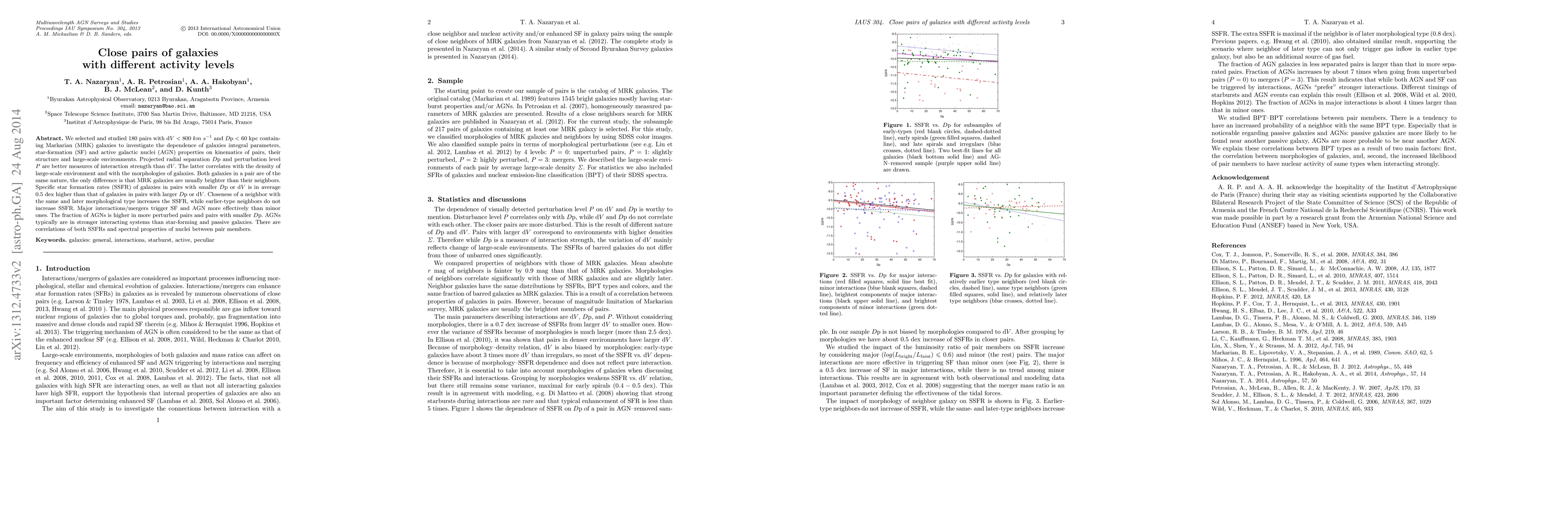 This study examines 180 close galaxy pairs with differing activity levels, finding that projected separation and perturbation level better indicate interaction strength than velocity separation. Star-formation rates are higher in closer pairs, especially when neighbors share similar morphological types.