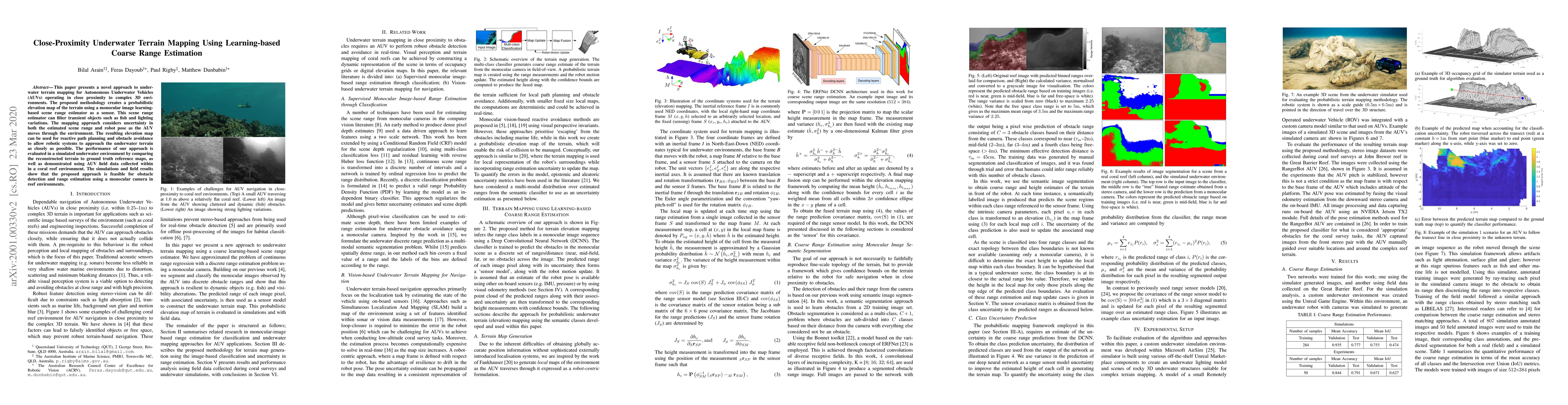 This paper presents a novel approach to underwater terrain mapping for Autonomous Underwater Vehicles (AUVs) operating in close proximity to complex 3D environments. The proposed methodology creates a probabilistic elevation map of the terrain using a monocular image learning-based scene range estimator as a sensor. This scene range estimator can filter transient objects such as fish and lighting variations. The mapping approach considers uncertainty in both the estimated scene range and robot pose as the AUV moves through the environment. The resulting elevation map can be used for reactive path planning and obstacle avoidance to allow robotic systems to approach the underwater terrain as closely as possible. The performance of our approach is evaluated in a simulated underwater environment by comparing the reconstructed terrain to ground truth reference maps, as well as demonstrated using AUV field data collected within in a coral reef environment. The simulations and field results show that the proposed approach is feasible for obstacle detection and range estimation using a monocular camera in reef environments.