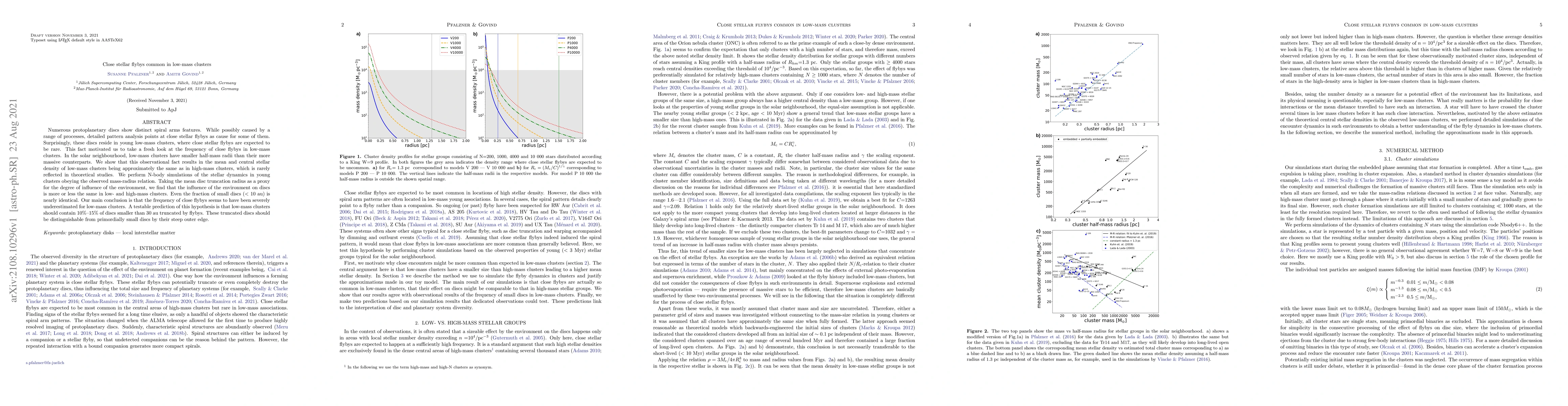 This paper finds that close stellar flybys, which create spiral features in protoplanetary discs, are more common in low-mass clusters than previously thought. Using N-body simulations and observational data, the authors demonstrate that low-mass clusters have similar mean and central stellar densities to high-mass clusters, leading to a higher frequency of close flybys.