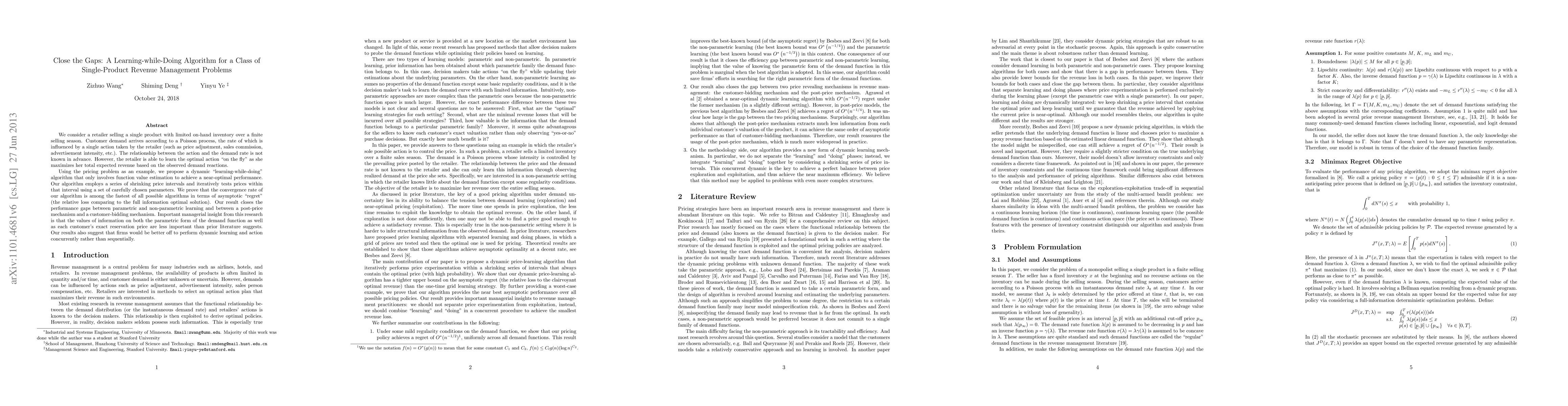 We consider a retailer selling a single product with limited on-hand inventory over a finite selling season. Customer demand arrives according to a Poisson process, the rate of which is influenced by a single action taken by the retailer (such as price adjustment, sales commission, advertisement intensity, etc.). The relationship between the action and the demand rate is not known in advance. However, the retailer is able to learn the optimal action "on the fly" as she maximizes her total expected revenue based on the observed demand reactions. Using the pricing problem as an example, we propose a dynamic "learning-while-doing" algorithm that only involves function value estimation to achieve a near-optimal performance. Our algorithm employs a series of shrinking price intervals and iteratively tests prices within that interval using a set of carefully chosen parameters. We prove that the convergence rate of our algorithm is among the fastest of all possible algorithms in terms of asymptotic "regret" (the relative loss comparing to the full information optimal solution). Our result closes the performance gaps between parametric and non-parametric learning and between a post-price mechanism and a customer-bidding mechanism. Important managerial insight from this research is that the values of information on both the parametric form of the demand function as well as each customer's exact reservation price are less important than prior literature suggests. Our results also suggest that firms would be better off to perform dynamic learning and action concurrently rather than sequentially.