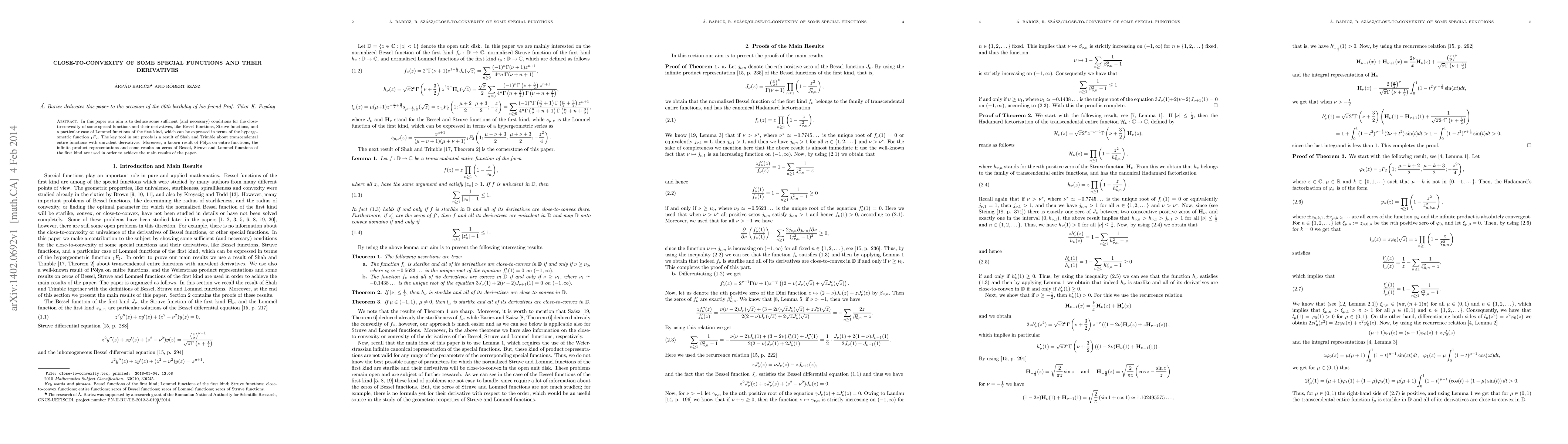 This paper establishes sufficient and necessary conditions for the close-to-convexity of special functions and their derivatives, including Bessel, Struve, and Lommel functions. It leverages Shah and Trimble's result on transcendental entire functions and Pólya's theorem, along with infinite product representations and zeros analysis, to achieve its findings.
