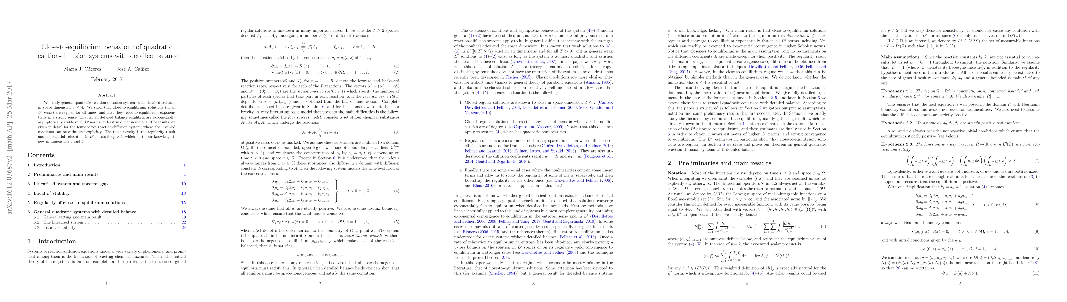 This paper investigates quadratic reaction-diffusion systems with detailed balance, proving that close-to-equilibrium solutions are regular and exponentially relax to equilibrium in $L^p$ norms for $p > 1$, especially in dimensions $d \leq 4$. The study notably provides explicit constants for the four-species system.