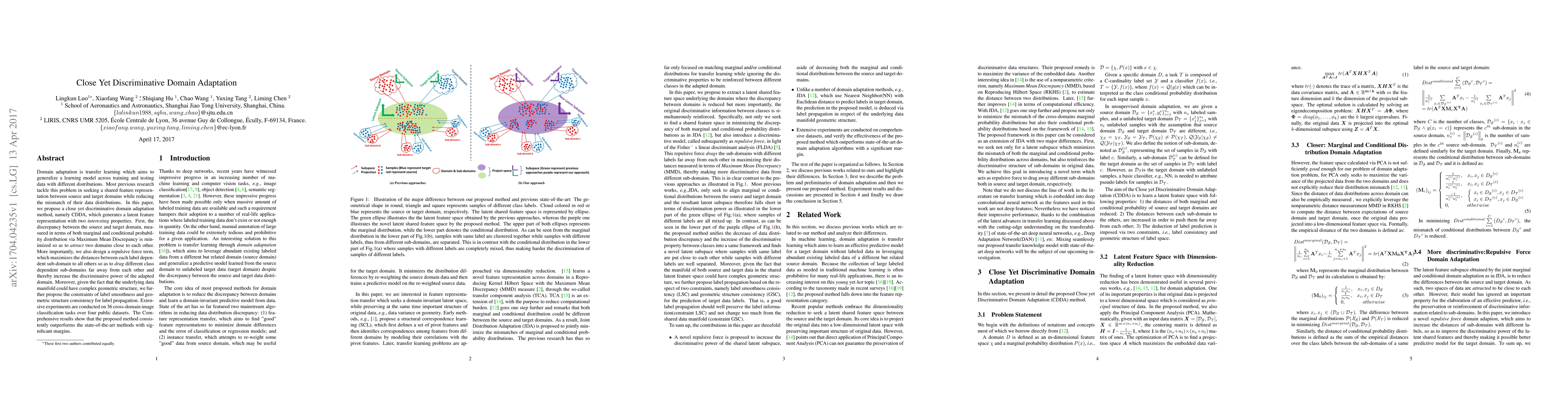 Domain adaptation is transfer learning which aims to generalize a learning model across training and testing data with different distributions. Most previous research tackle this problem in seeking a shared feature representation between source and target domains while reducing the mismatch of their data distributions. In this paper, we propose a close yet discriminative domain adaptation method, namely CDDA, which generates a latent feature representation with two interesting properties. First, the discrepancy between the source and target domain, measured in terms of both marginal and conditional probability distribution via Maximum Mean Discrepancy is minimized so as to attract two domains close to each other. More importantly, we also design a repulsive force term, which maximizes the distances between each label dependent sub-domain to all others so as to drag different class dependent sub-domains far away from each other and thereby increase the discriminative power of the adapted domain. Moreover, given the fact that the underlying data manifold could have complex geometric structure, we further propose the constraints of label smoothness and geometric structure consistency for label propagation. Extensive experiments are conducted on 36 cross-domain image classification tasks over four public datasets. The comprehensive results show that the proposed method consistently outperforms the state-of-the-art methods with significant margins.