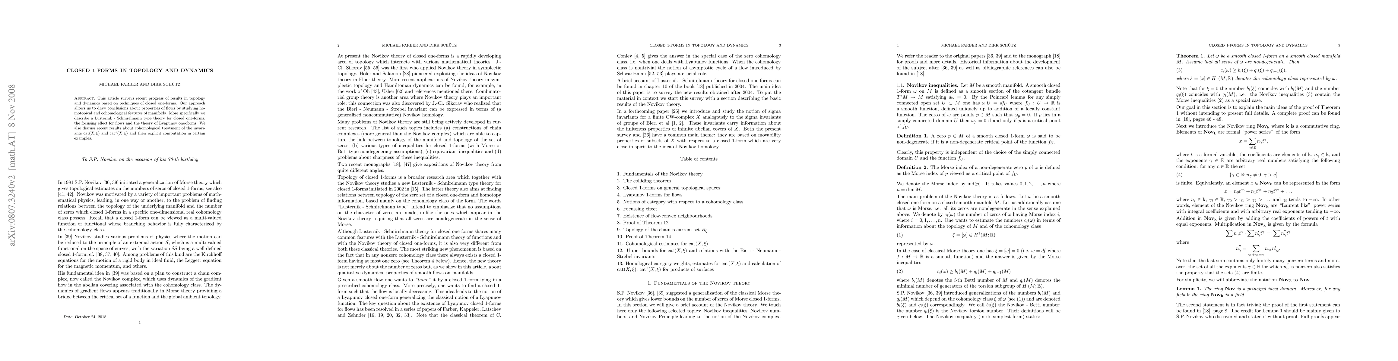 This article surveys recent progress of results in topology and dynamics based on techniques of closed one-forms. Our approach allows us to draw conclusions about properties of flows by studying homotopical and cohomological features of manifolds. More specifically we describe a Lusternik - Schnirelmann type theory for closed one-forms, the focusing effect for flows and the theory of Lyapunov one-forms. We also discuss recent results about cohomological treatment of the invariants cat(X, \xi) and cat^1(X, \xi) and their explicit computation in certain examples.