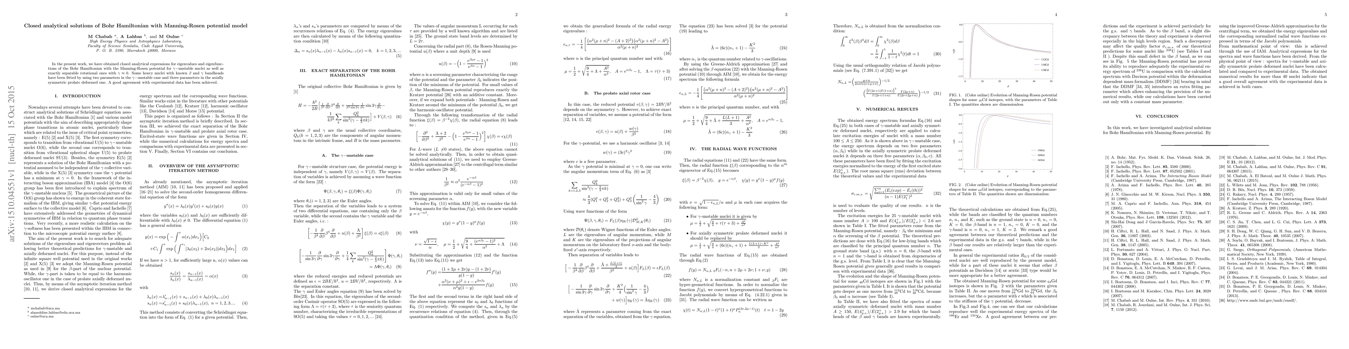 This paper presents closed analytical solutions for the Bohr Hamiltonian with the Manning-Rosen potential, providing exact expressions for eigenvalues and eigenfunctions for both γ-unstable and rotational nuclei. The model fits heavy nuclei bandheads with parameters, achieving good agreement with experimental data.